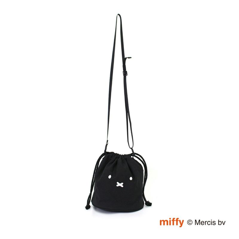 ミッフィーのフェイスがかわいい巾着ショルダーバッグ。子どもから大人まで持てるカジュアルさ。ひょっこりと覗くミッフィーのタグや内装のミッフィーのフェイス総柄など細部までこだわったデザイン。