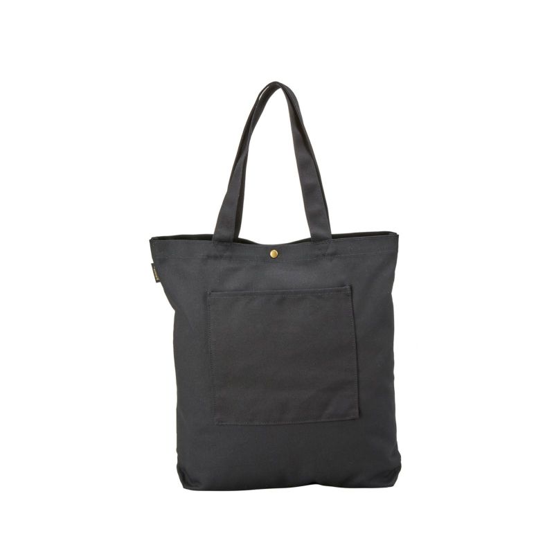 軽くて丈夫な帆布素材。A4サイズが入る大きさです。開口部はマグネットボタン仕様。内装は小物を収納できるポケット付きで、背面にも大き目のポケット付き。