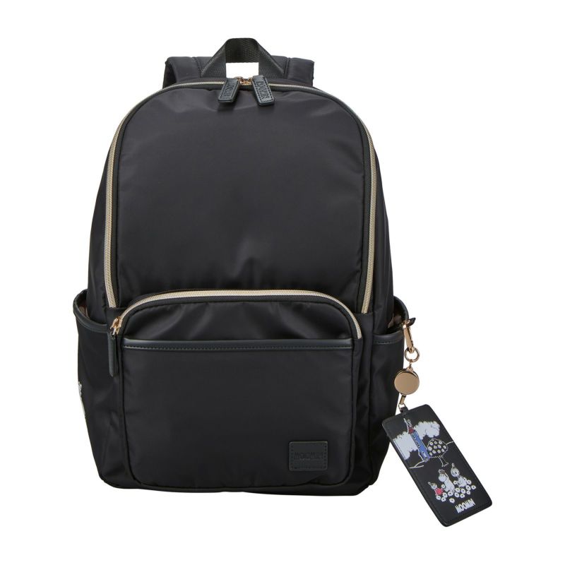 パスケースがついたムーミンのラウンドリュック。ブラックの生地に、ゴールドのファスナーが映えて大人カワイイ。パスケースにはリトルミイ・スノークのおじょうさん・ミムラねえさんが描かれており、リールもついていて便利。片側サイドにパスケースを取りつけるキーフックもついています。