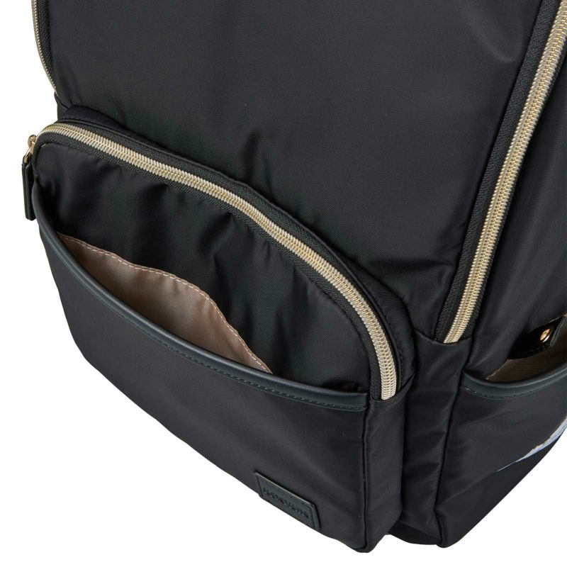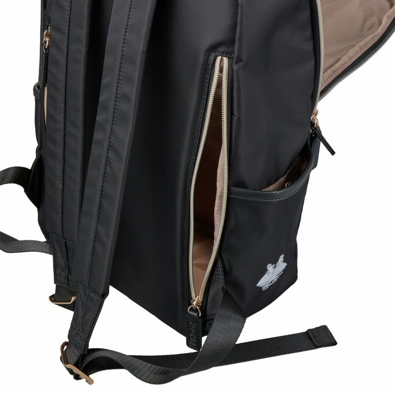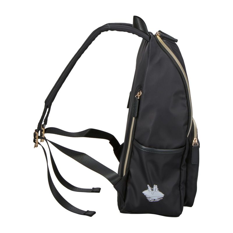 メイン収納部分のファスナーはガバっと大きく開くことが出来るので、収納アイテムの出し入れがしやすい。リュック背面についたファスナーからメイン収納内にアクセスすることも出来るので、リュックを背負ったまま荷物を取り出すことが出来て便利です。また、内装にはポケットもついているので、細かなものの収納に便利。両サイドやフロント部分にもポケットがついています。両サイドポケットにはムーミンとその仲間達が描かれています。
