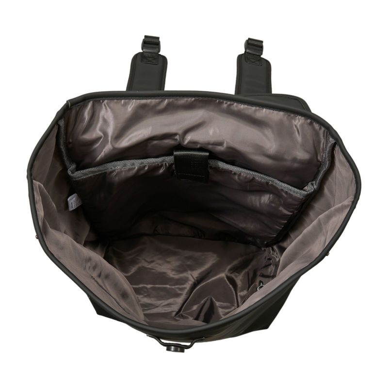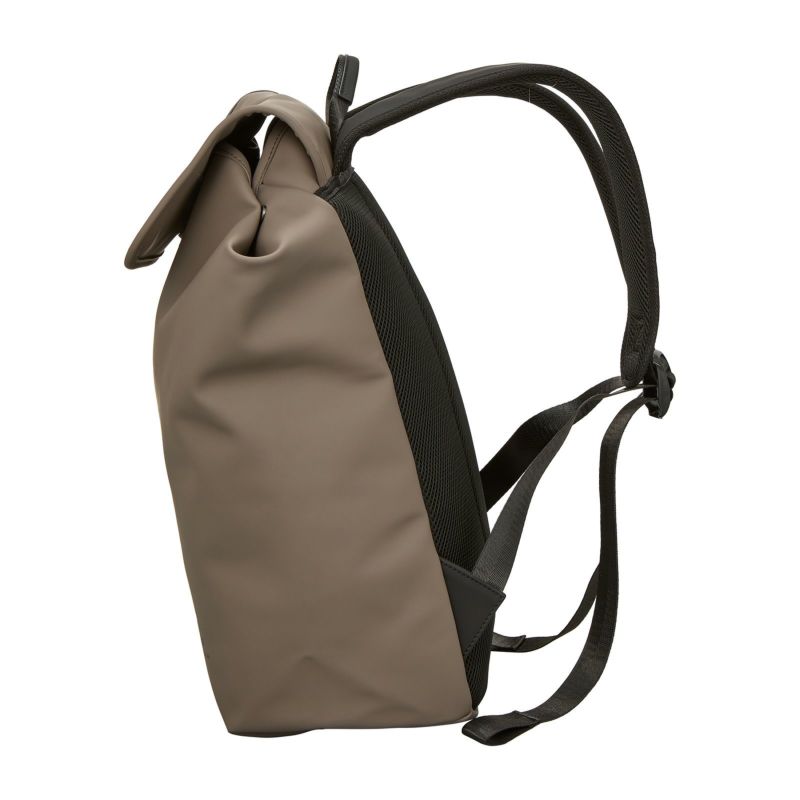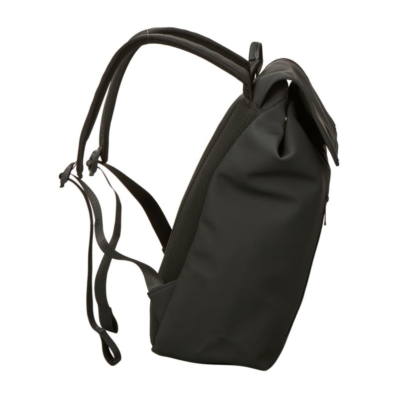 フラップデザインのリュックサック。開閉口の両サイドにはスナップボタンが付いており、スナップボタンを留めたり外したりすることで容量を調節できます。マチ15cm、容量16Lで収納力もあり、A4が入るサイズ感。内装にはノートPCやタブレットを入れるのに便利なポケットも付いています。