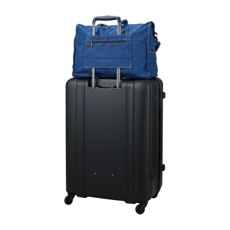 普段使いから旅行用まで、幅広く使えるデニムのボストンバッグ。使わないときはコンパクトに折りたたんでスーツケースやカバンの中に。使いたいときにぱっと広げて使えます。バッグ背面にはスーツケースのキャリーバーに通せるようにキャリーバー通しが付いているので、旅行の際はとっても便利。