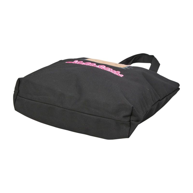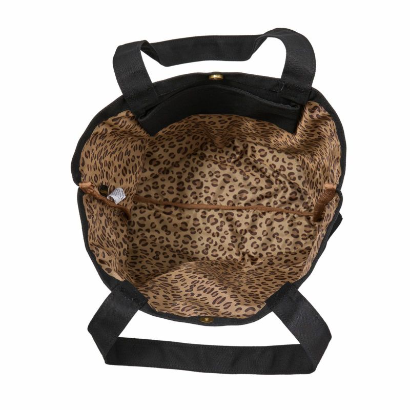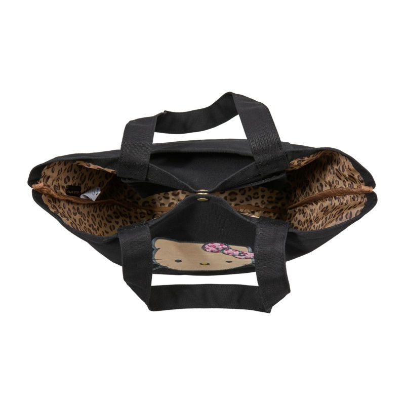 日焼けデザインのハローキティのトートバッグ。日焼けデザインのハローキティがピンクのヒョウ柄リボンをつけたお顔の刺繍がかわいい。トートバッグのブラックの生地に映えるピンクのロゴも大人かわいいデザインです。内装はヒョウ柄でかわいいが詰まったトートバッグです。