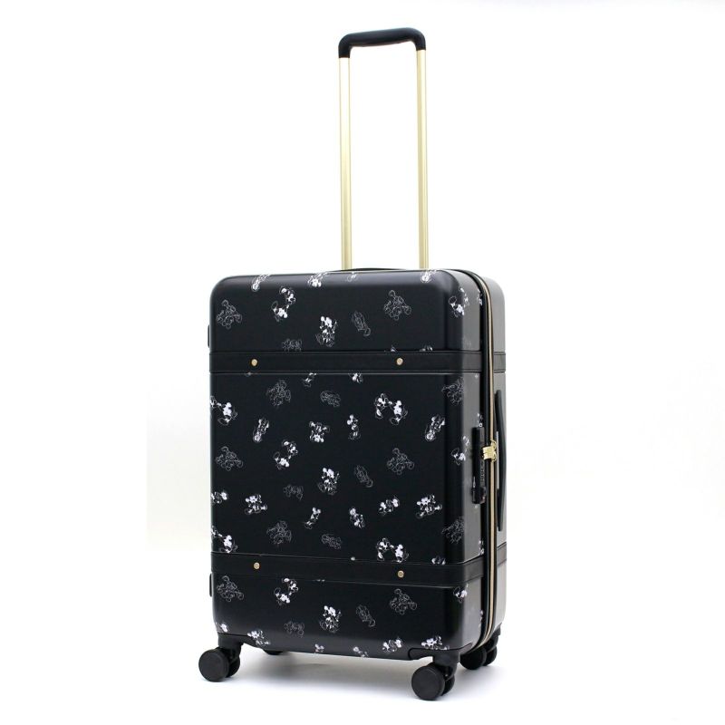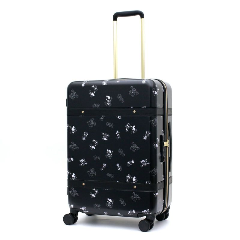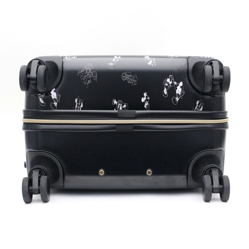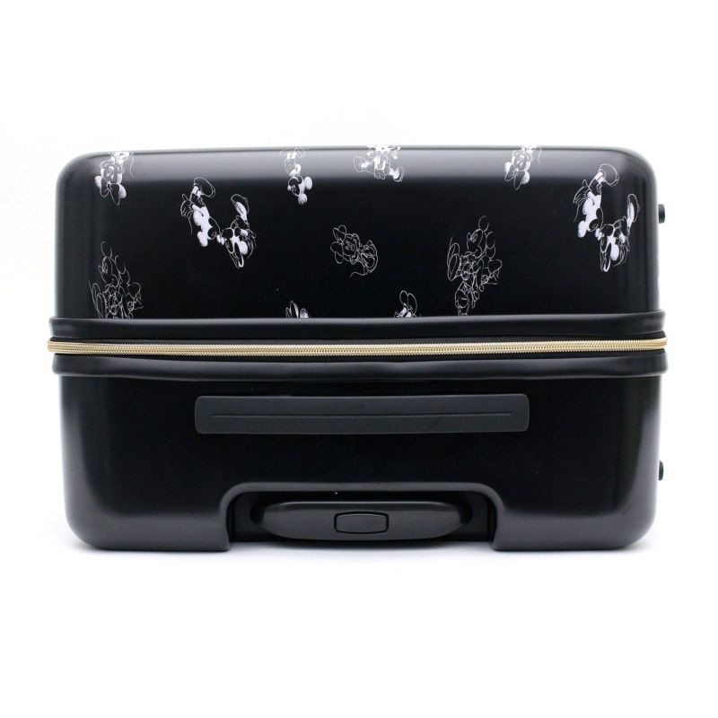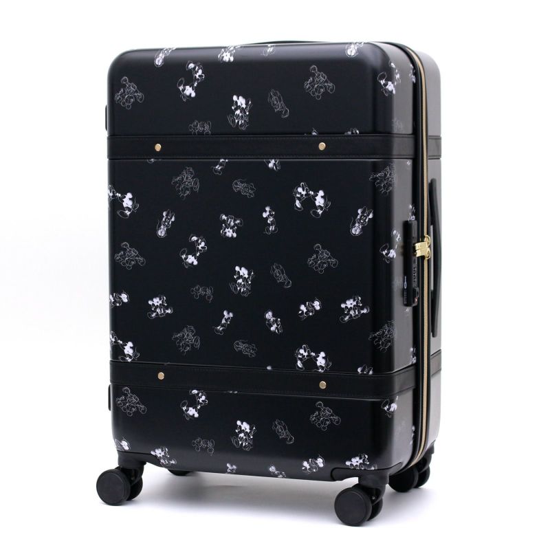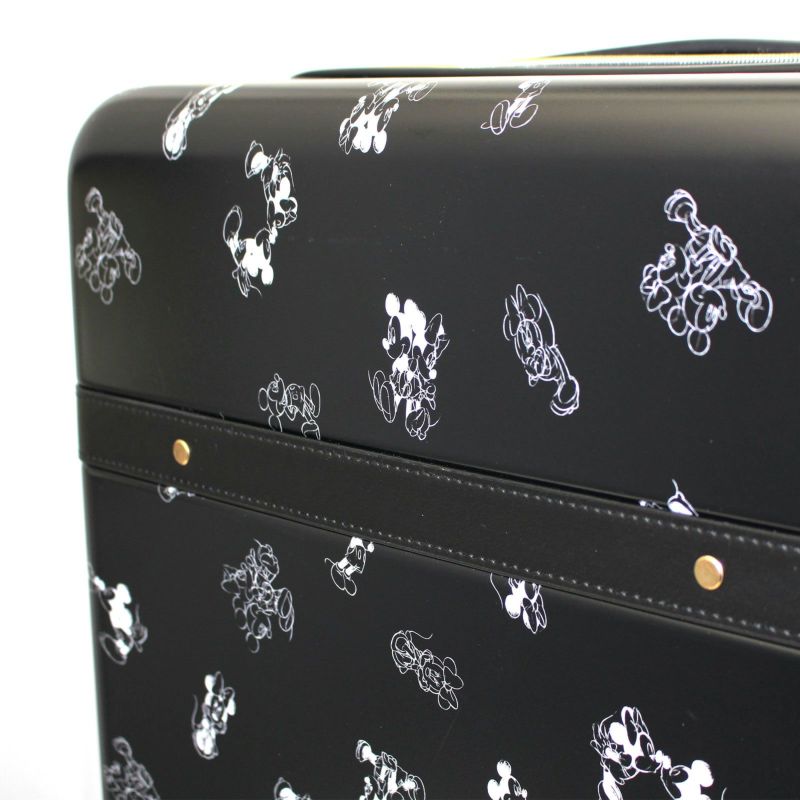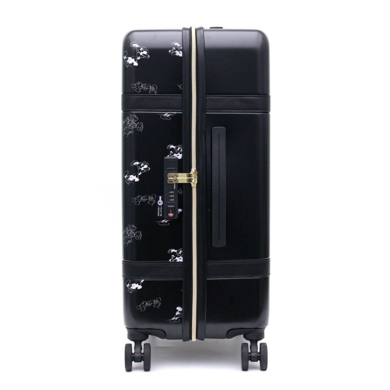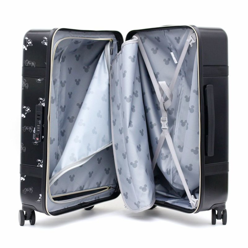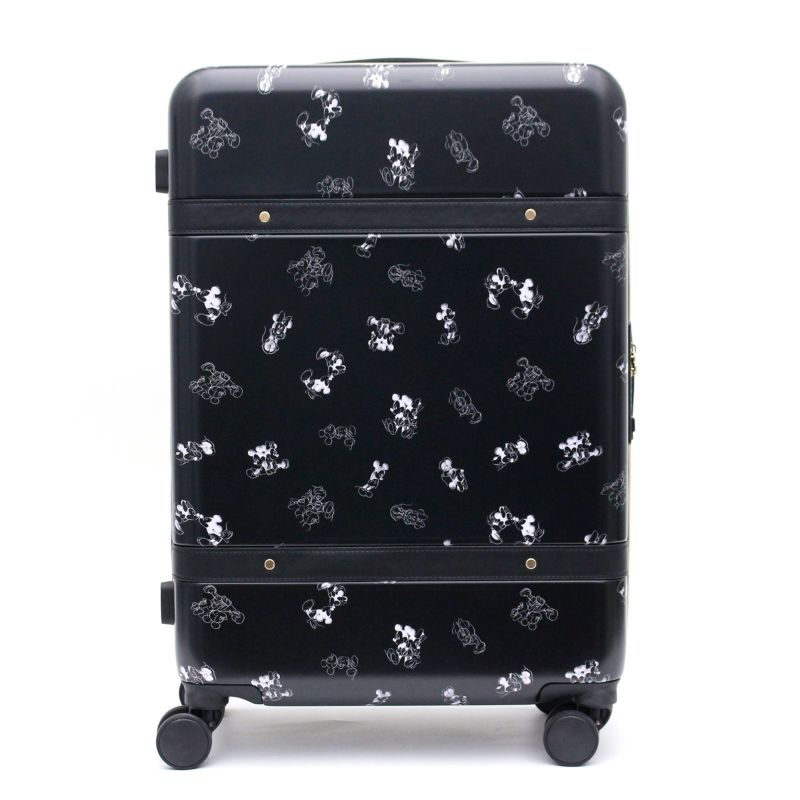 前面はブラックベースにミッキーとミニーがスケッチ風に描かれており、背面は無地のブラックでシンプルなデザイン。ボディーに埋め込まれた2本の合皮バンドがおしゃれで落ち着いた雰囲気を演出します。内装生地はミッキーのお顔の総柄デザイン。外側のロックのファスナートップにもミッキーのお顔がデザインされており、細部までデザインにこだわっています。