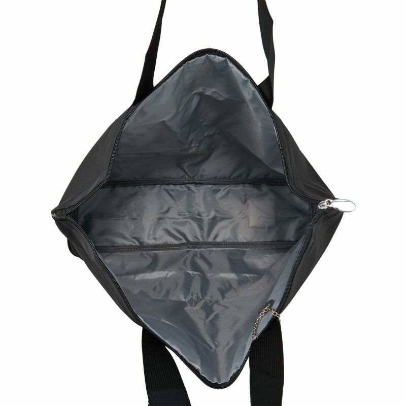 旅行用だけでなく、普段のエコバッグやサブバッグとしても使えるサイズ感です。バッグの開口部はファスナーで閉じられるので中身がこぼれる心配がありません。