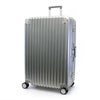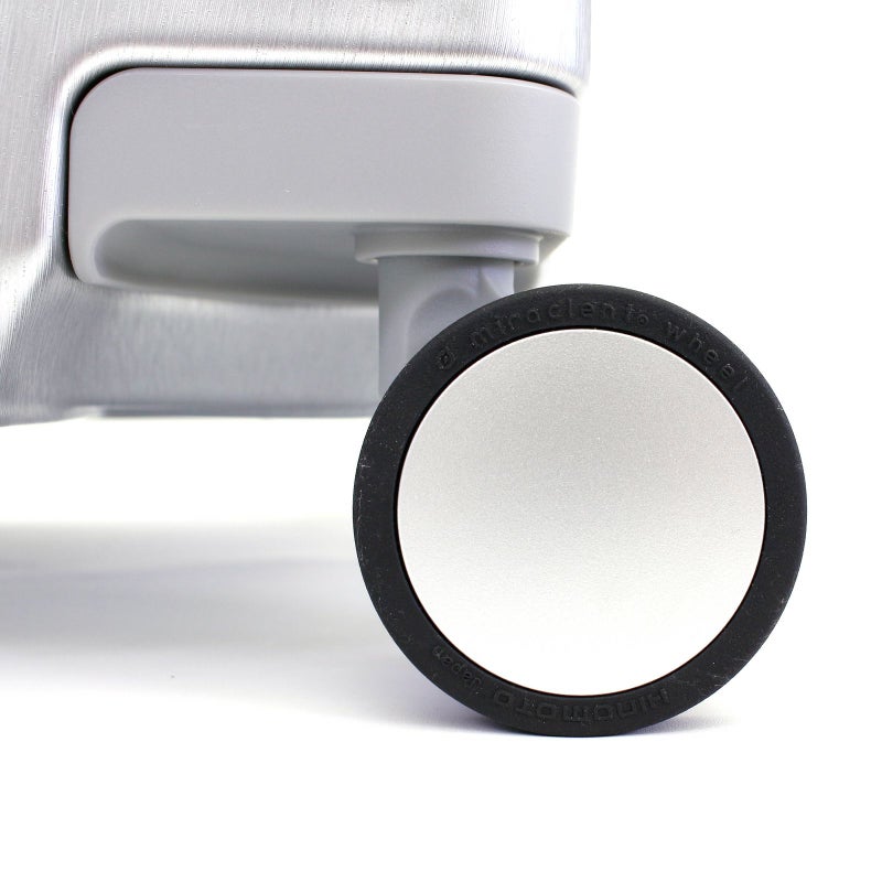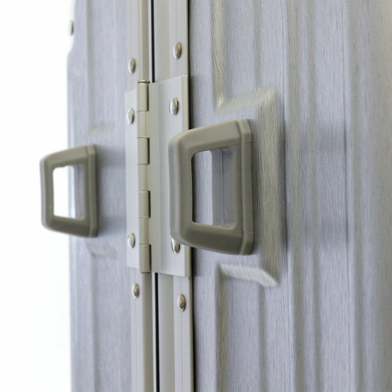 ボディは本物のアルミニウムのようなアルミ調ポリカーボネートフィルムを使用。アルミよりも自重が軽く仕上げられ、移動する際のからだの負担を軽減します。ボディのコーナーパッドはアルミ製を採用。角の傷つきやへこみからスーツケースを守ります。