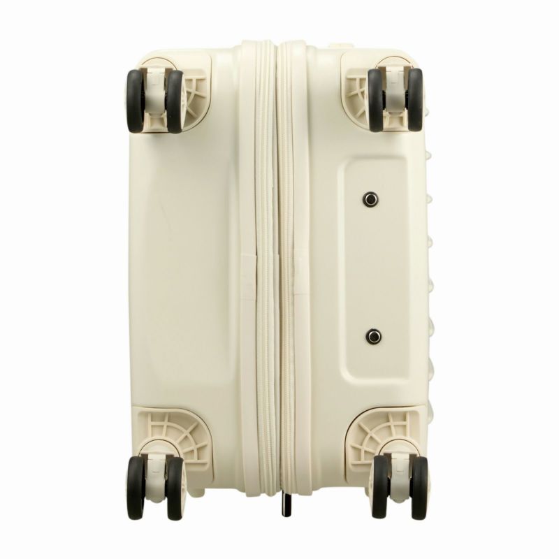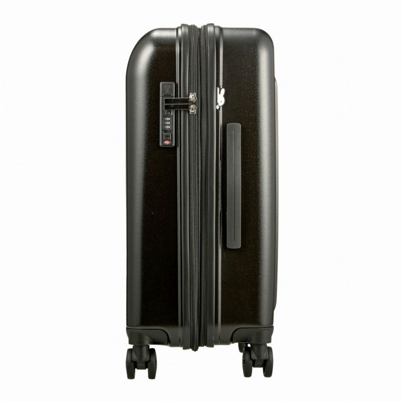 スーツケースのボディ前面にプリントされたミッフィーのお顔が可愛い!ボディ背面にはミッフィーのロゴプレートが付いており、側面にはひょっこりとのぞくミッフィーのタグがついています。内装はベージュの生地にミッフィーとお花の総柄デザイン、そして内装ファスナートップはミッフィーの形をしていて可愛さ満載!