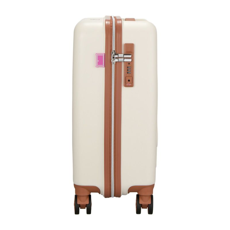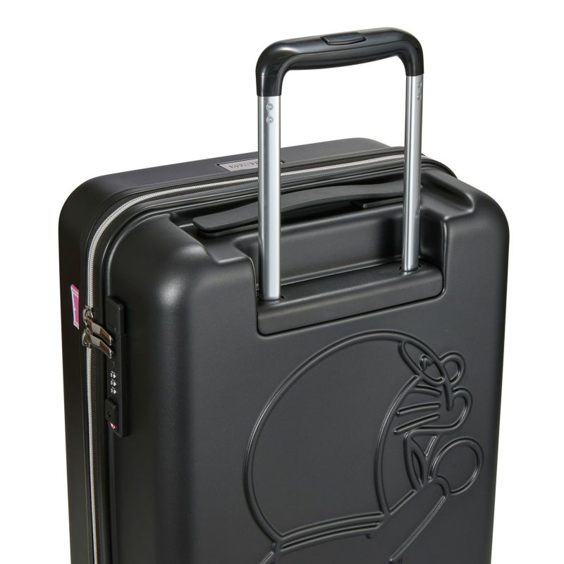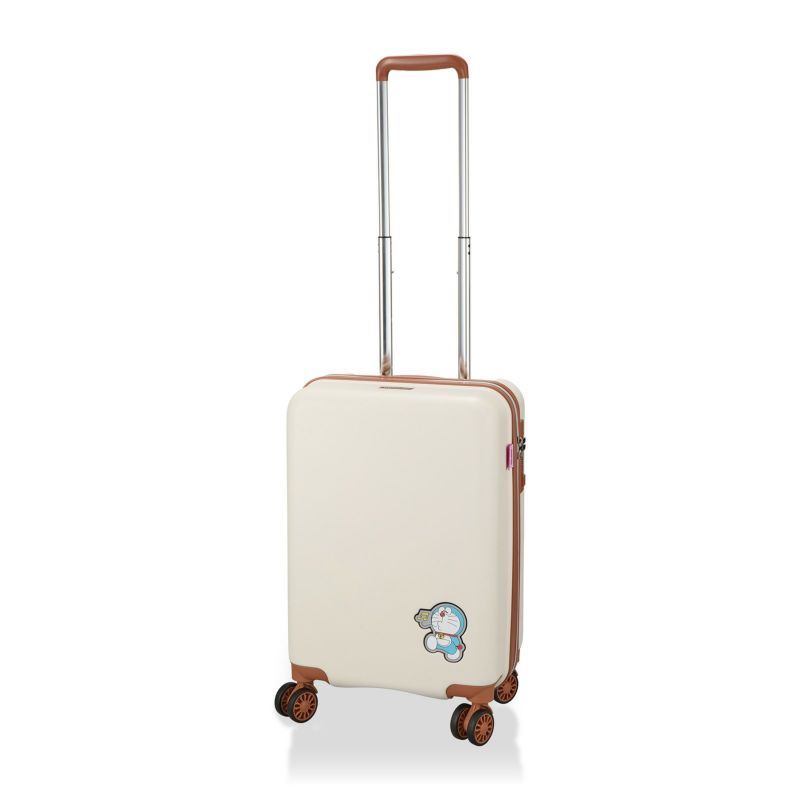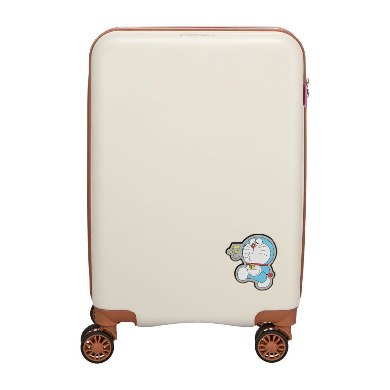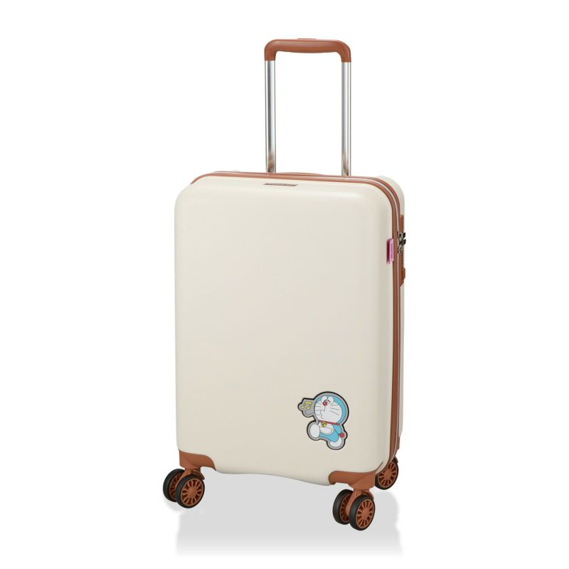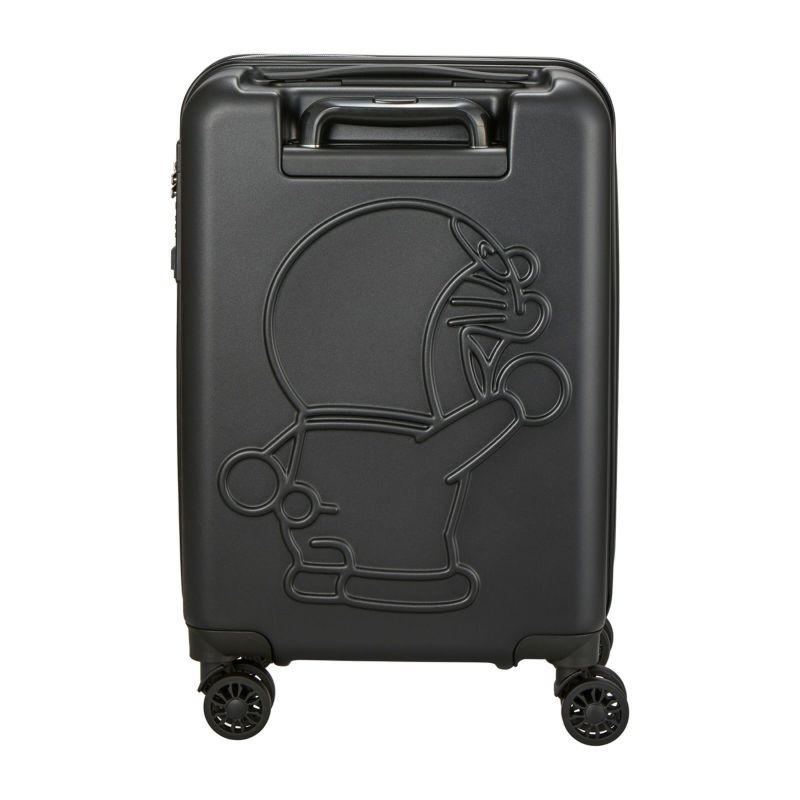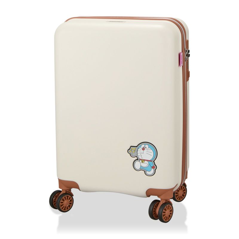 ドラえもんのジッパータイプスーツケース。スーツケースの前面右下には口笛を吹くドラえもんのデザインが!背面にはドラえもんの後ろ姿がエンボスデザインされています。また、側面にはどこでもドアのタグがついており、細部までこだわったデザインです。