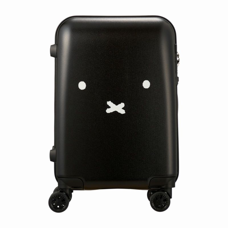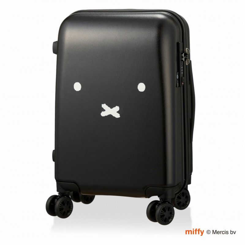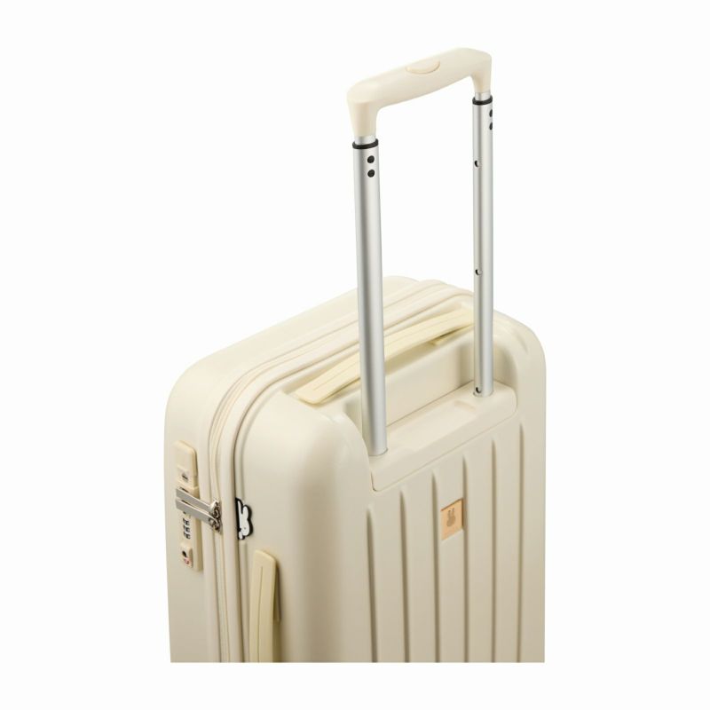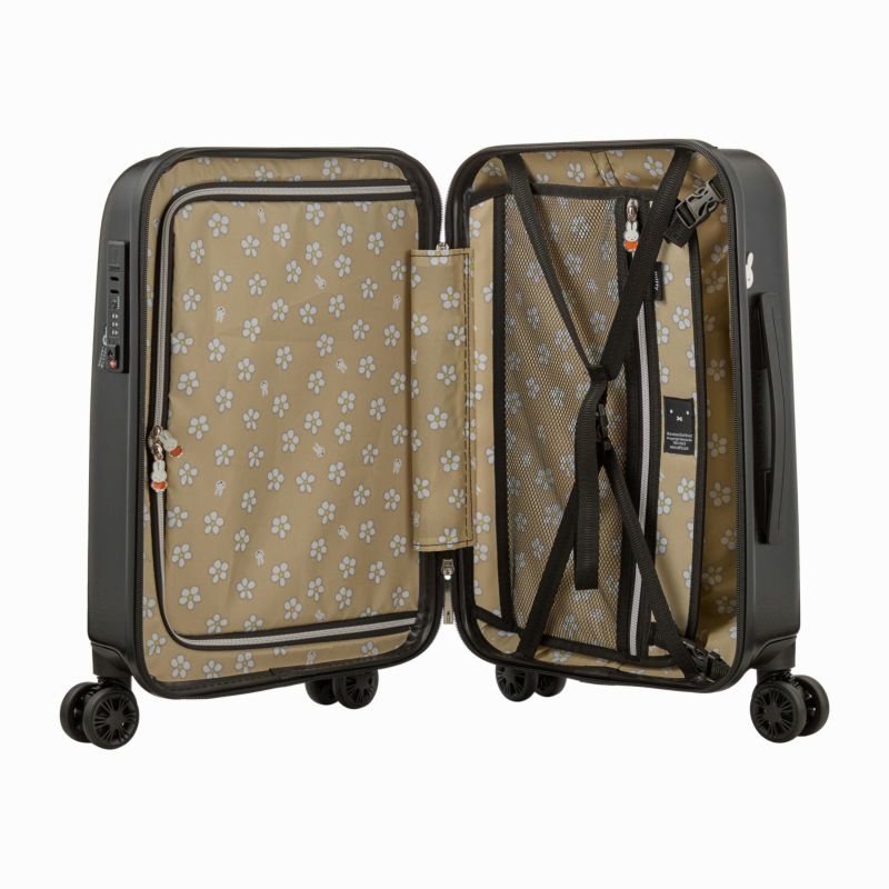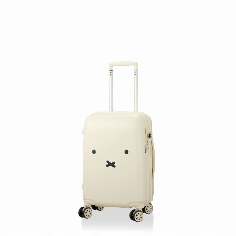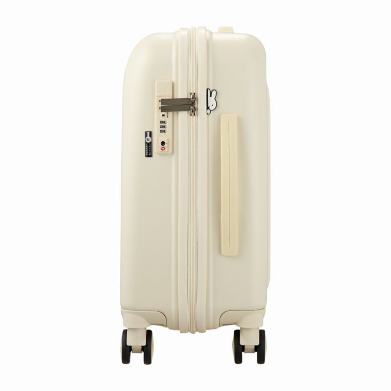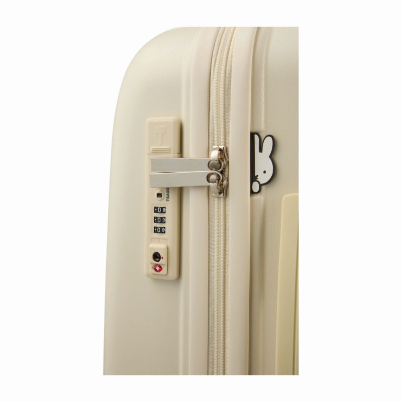 スーツケースのボディ前面にプリントされたミッフィーのお顔が可愛い!ボディ背面にはミッフィーのロゴプレートが付いており、側面にはひょっこりとのぞくミッフィーのタグがついています。内装はベージュの生地にミッフィーとお花の総柄デザイン、そして内装ファスナートップはミッフィーの形をしていて可愛さ満載!