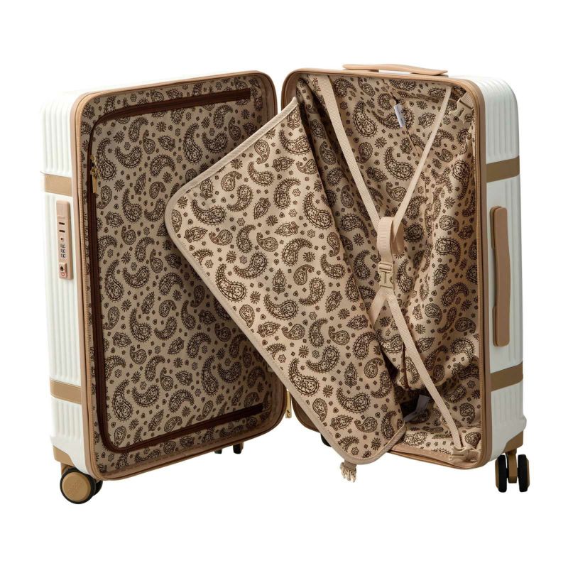 ジル&ジャックがデザインされたネームタグ付き。スーツケースの内装はジル、ジャック、ドッグ、キャットがデザインされたペイズリー柄を採用。フタ側の内装はファスナーで閉じられるので、開閉時に荷物がこぼれる心配がありません。胴側の内装は荷崩れを防止するクロスベルトと間仕切り付き。