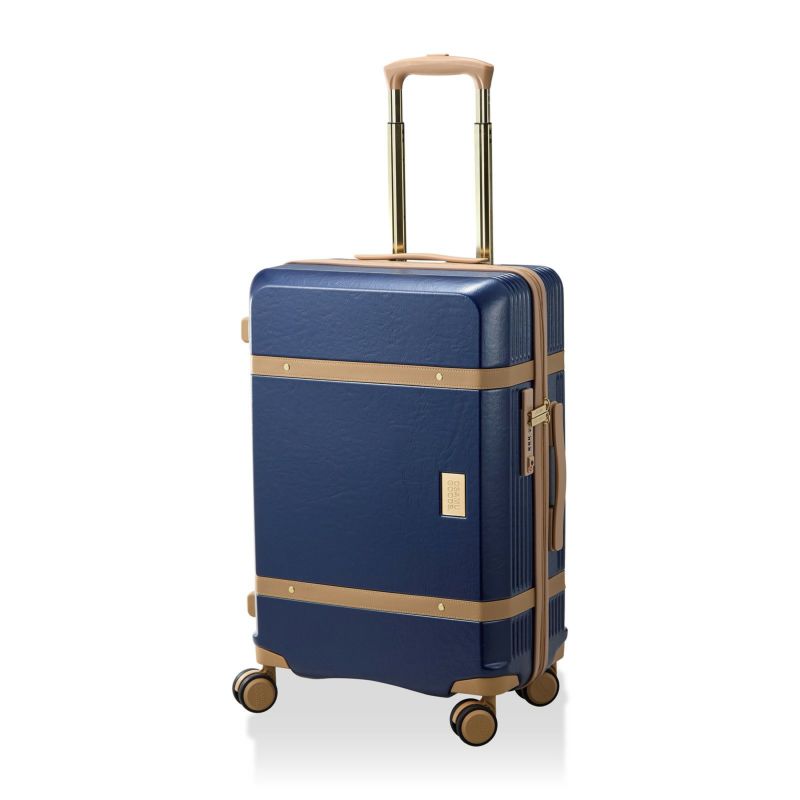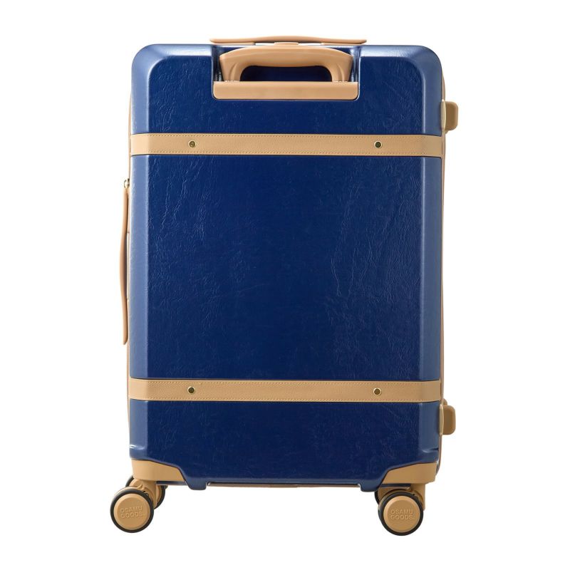 メインファスナーとキャスターにはOSAMU GOODSのロゴが入っています。双輪キャスターを採用し、安定した走行が可能です。スーツケースの片側側面は台座フック付きなので、コンビニの袋等軽いものを掛けることができます。