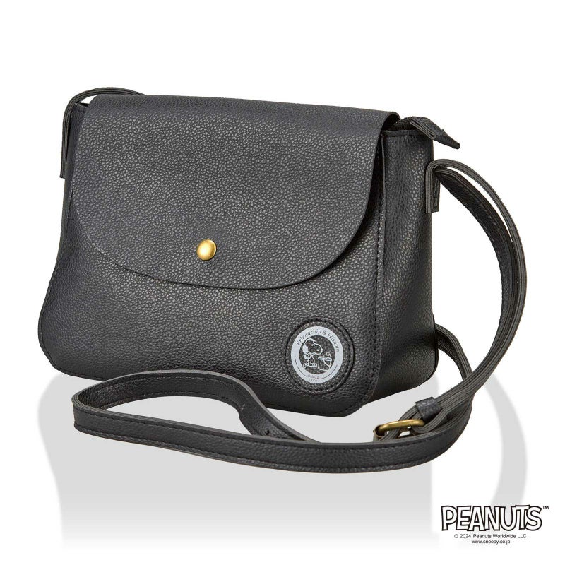 スタイリッシュな見た目を演出する、前面マグネットフラップのショルダーバッグ。フェイクレザーでカジュアルすぎない風合い。バッグ前面の右下にはスヌーピーのイラストが描かれたワッペンが付いています。ショルダーベルトは長さ調節可能。