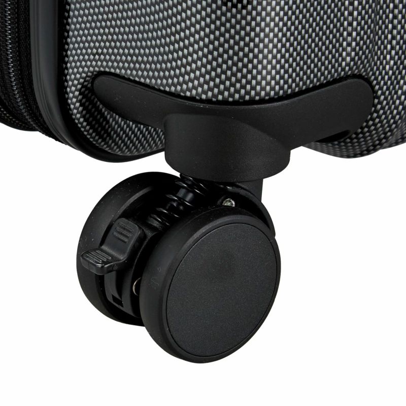 キャスターはダブルキャスターなので凹凸の多い路面でも安定した走行が可能。更に衝撃吸収サスペンションキャスターなので振動が手に伝わりにくく疲れにくい。さらに電車等に乗った際に便利なストッパー機能付き。