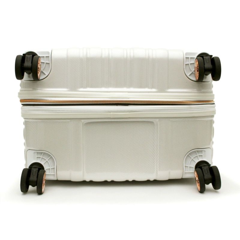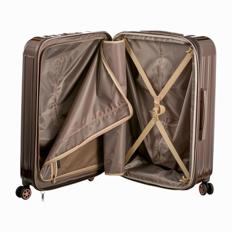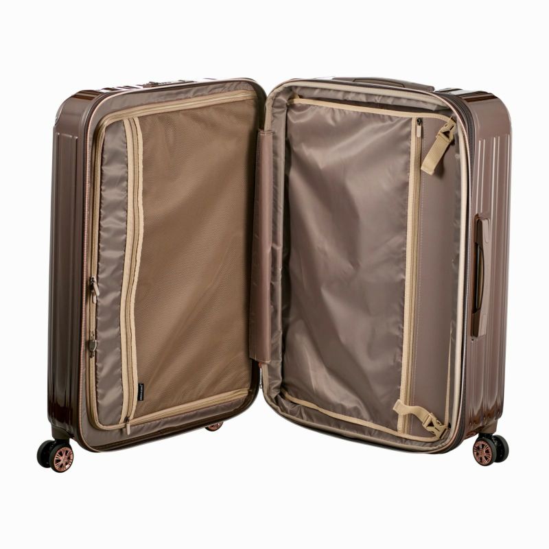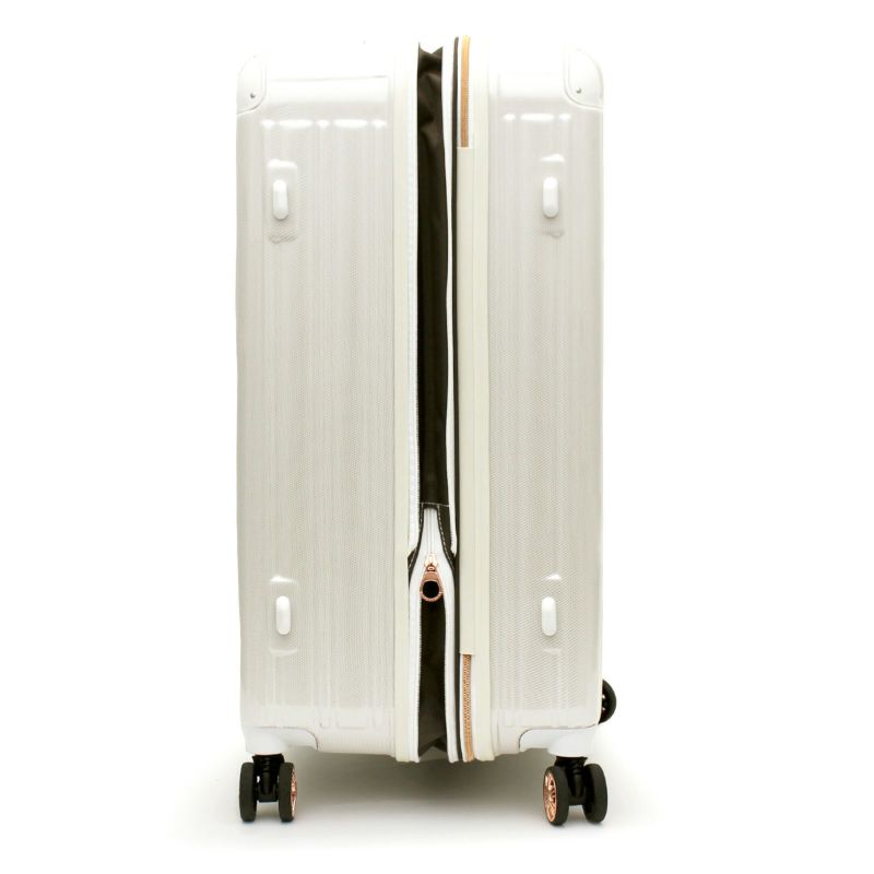 ボディには剛性・耐衝撃性がある『ABS樹脂』に、飛行機の窓などにも使われる頑強&軽量素材の『ポリカーボネート』を加えた混合素材を採用。頑強なボディで大切なお荷物を守ります。フタ側の仕切りはファスナーで閉じられるので、開閉の際に荷物がこぼれる心配がありません。