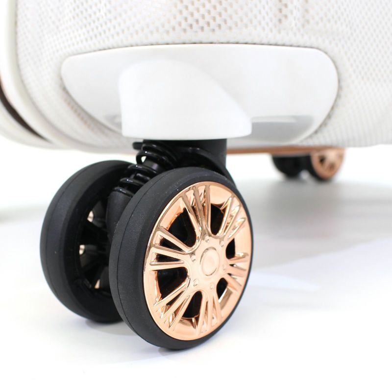 荷物やお土産が増えても安心の『拡張機能』搭載。拡張ファスナーを広げると容量が約20%アップ。安定した走行が可能な双輪キャスターは凸凹道でも衝撃を吸収するサスペンション付き。スムーズ&軽やかで快適な走行を実現しました。さらにキャスターに抗菌加工を施しいつでも快適。