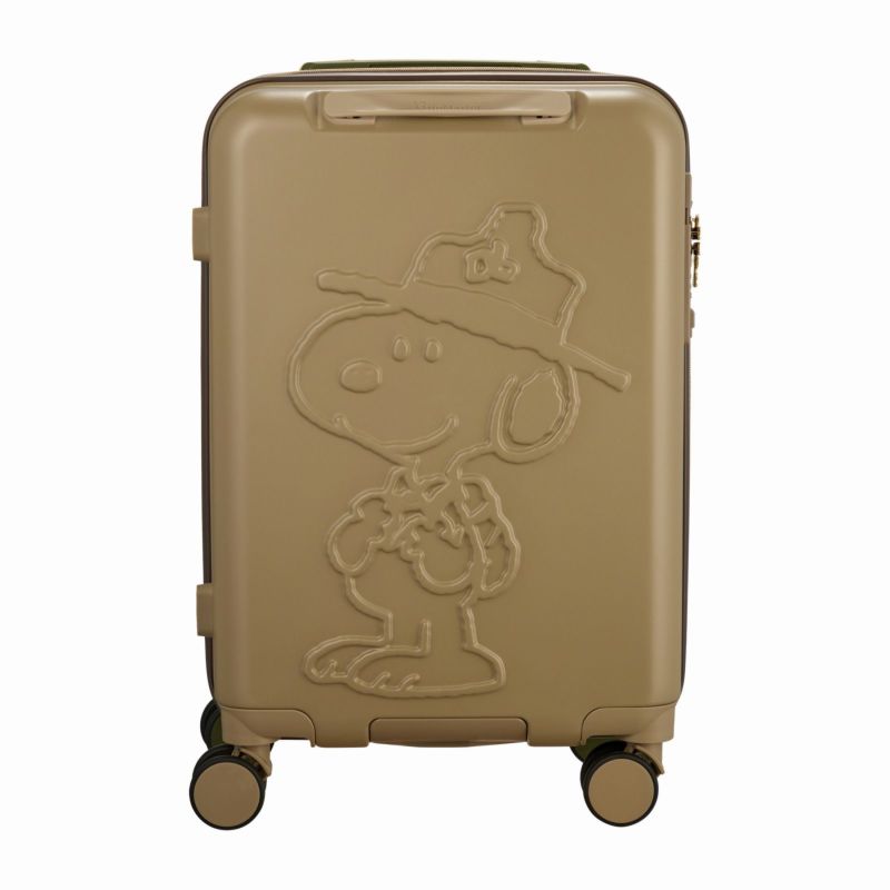 スヌーピーが大きくデザインされたスーツケース。背面にはウッドストック、外側のファスナートップにはスヌーピーとウッドストックがデザインされています。前面と背面で色が異なるツートンカラー。キャスターもそれぞれ同色でまとめています。内装はスヌーピーと仲間たちがいっぱいの賑やかなデザイン。内装のデザインはPN129番色がビーグルスカウト柄、PN138とPN139番色がバスストップ柄です。内装のファスナートップにもスヌーピーがデザインされています。フタ側の仕切りはファスナーで閉じられるので、開閉時に荷物がこぼれる心配がありません。