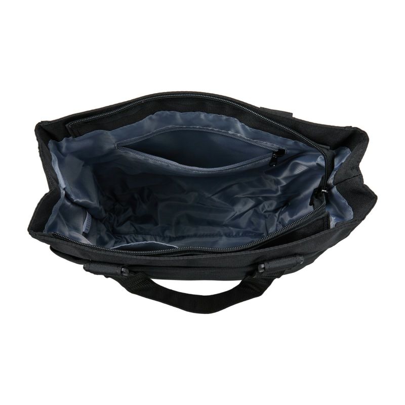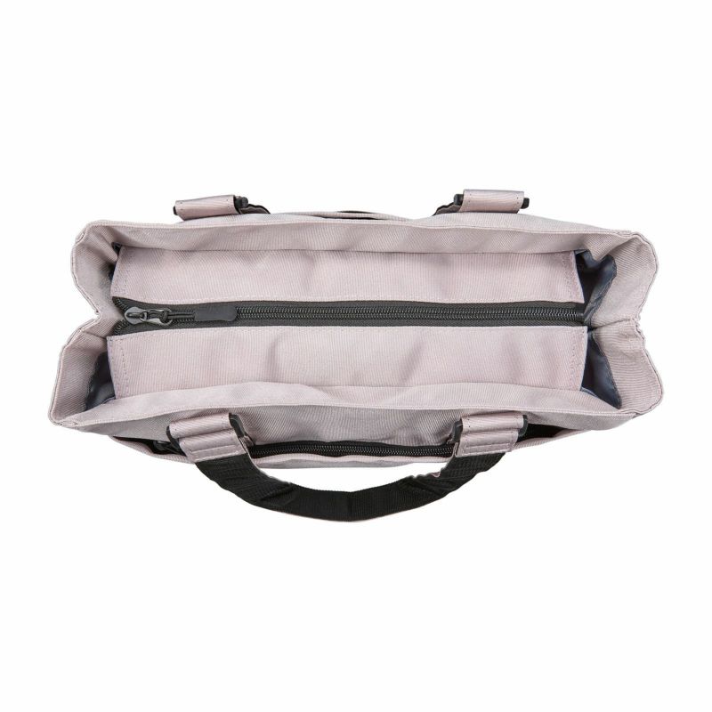 開口部はファスナー開閉式。ファスナーの引手に紐が付いているので、開閉がスムーズです。内装にはファスナーポケットとフリーポケットが付いています。バッグの前面にはファスナーポケットが付いており、背面には面ファスナー式のポケットが付いています。さらに側面にもポケットが付いています。