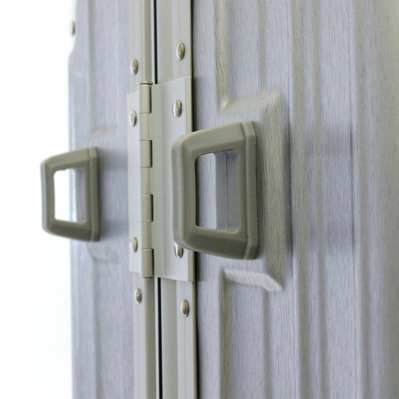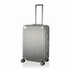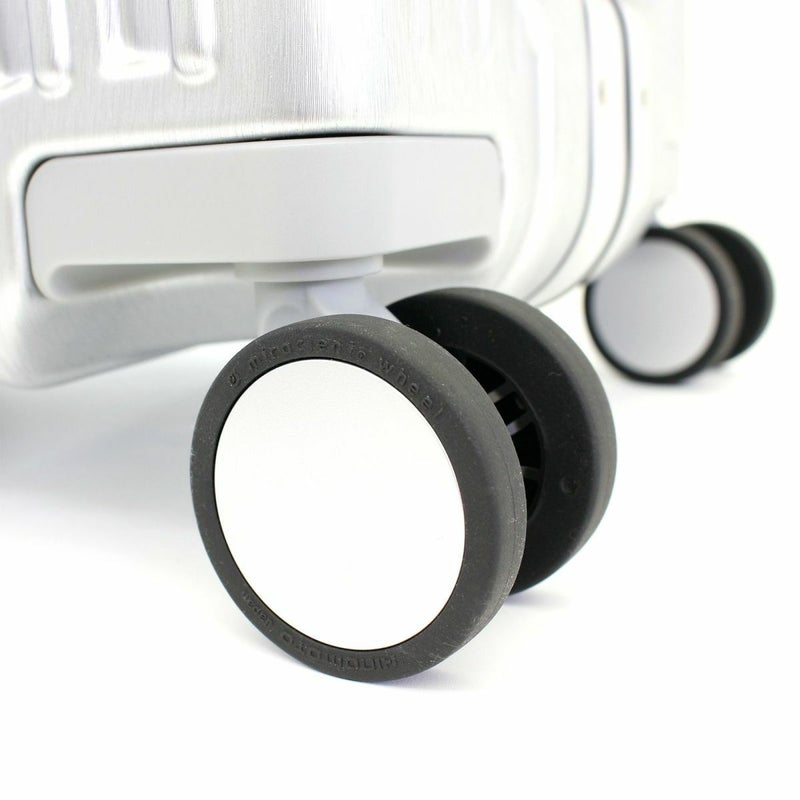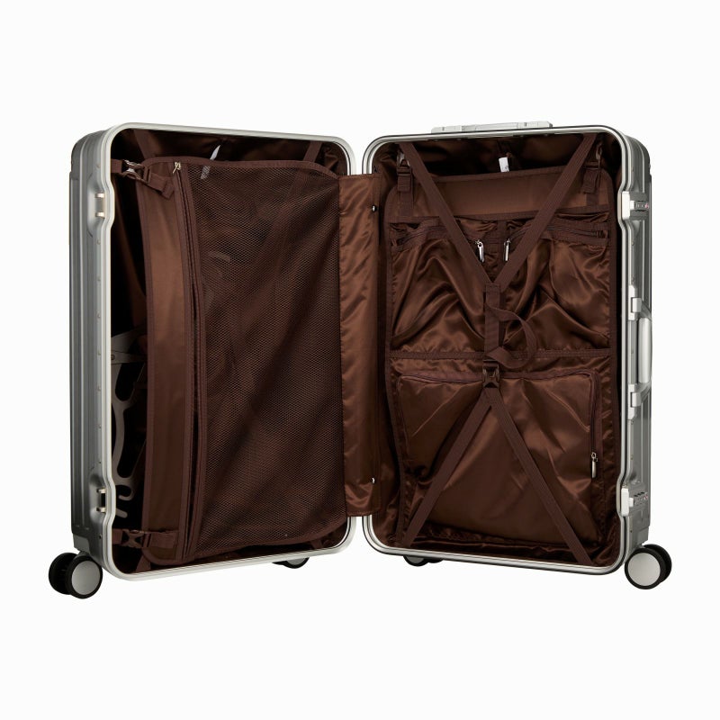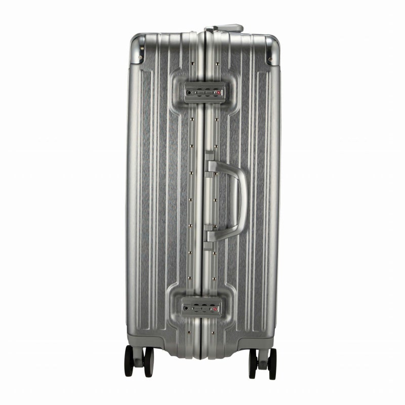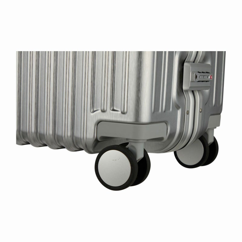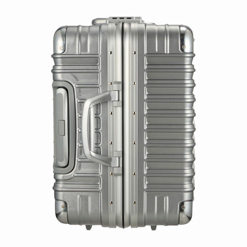 ボディは本物のアルミニウムのようなアルミ調ポリカーボネートフィルムを使用。アルミよりも自重が軽く仕上げられ、移動する際のからだの負担を軽減します。ボディのコーナーパッドはアルミ製を採用。角の傷つきやへこみからスーツケースを守ります。