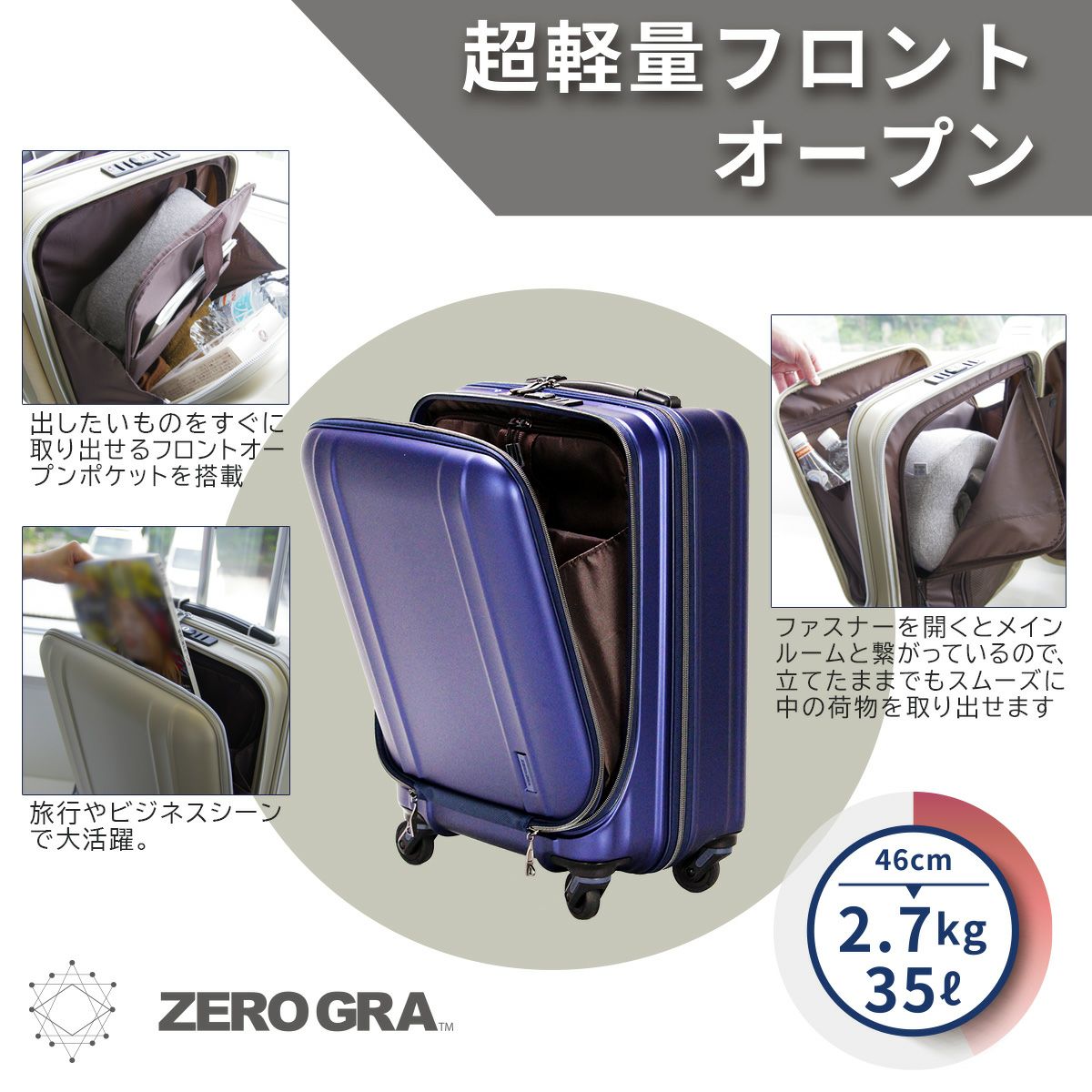 他の画像を見る オリジナルブランド ZERO GRA 5年保証 ゼログラ 前パカ 静音シングルキャスター 日乃本錠前キャスター 超軽量 スーツケース フロントオープン 機内持ち込み Sサイズ ZERO GRA ZER2094-46 販売価格 ¥ 26,400 税込 在庫切れ