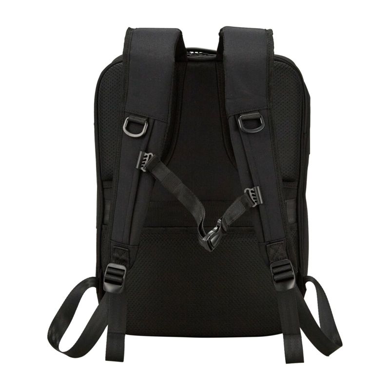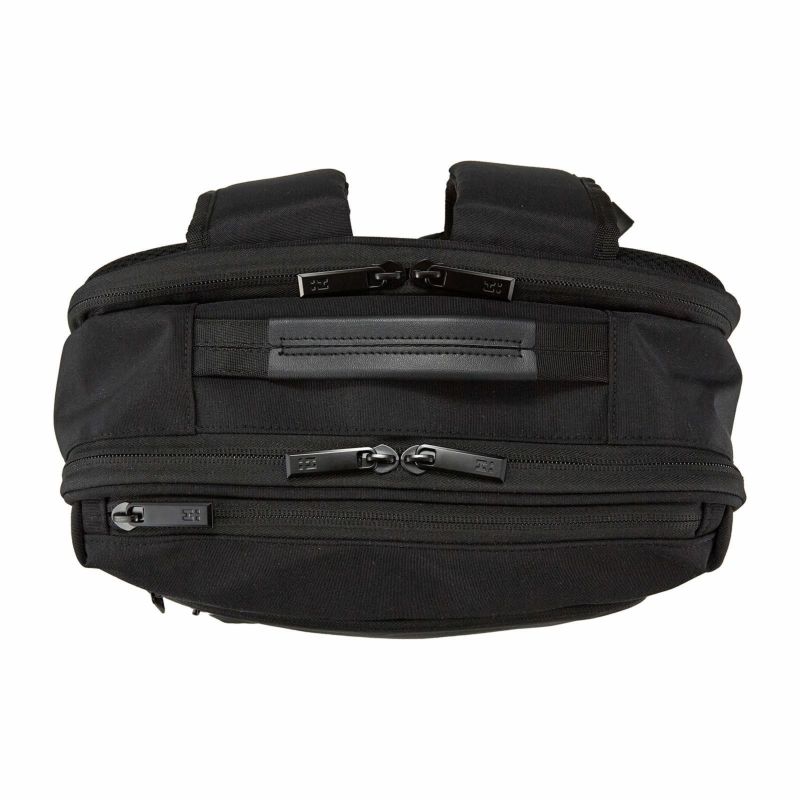 リュック背面にはキャリーオンバンドが付いており、スーツケースに装着することができるので出張や旅行時に便利。リュックを背負った時に肩からのずり落ちを防ぐチェストベルトも付いています。リュック上部と側面には持ち手も付いているので、片手で持ち運ぶことも可能です。