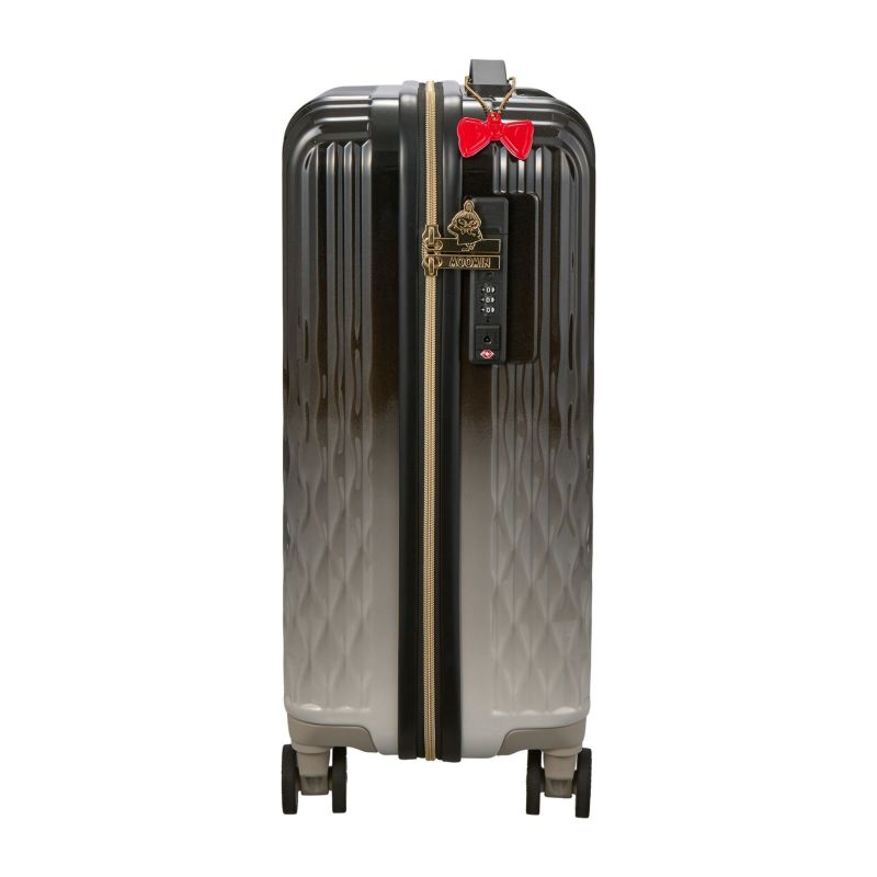 スーツケースのボディが黒とグレーのグラデーションでモノトーンな雰囲気。ボディ前面右下のリトルミイのプレートがワンポイントで可愛い。リトルミイの赤いリボンの形をしたリフレクトチャーム付きです。内装は様々な表情をしたリトルミイがピクニックでりんごやお花、ジャムやバスケットに囲まれている様子が描かれた総柄模様。ロックのファスナートップにはリトルミイとMOOMINロゴがあしらわれています。キャスターにもMOOMINロゴが!細部までこだわったデザインです。