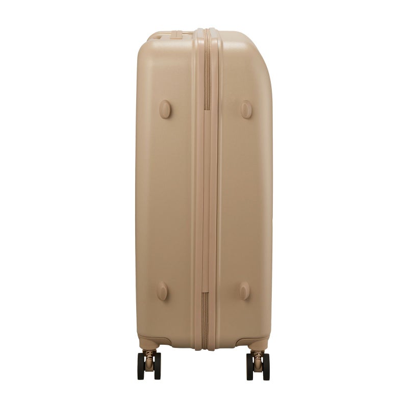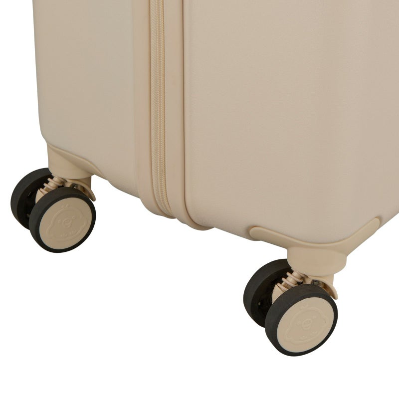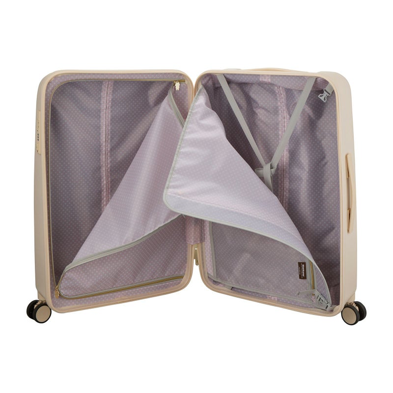 スーツケースのロック部分のファスナートップにはリラックマとキイロイトリがデザインされており、ロックを開けてスーツケースを開くと、内装は「RK33.リラックマニューベーシック」は水色の水玉デザイン、「RK40.コリラックマニューベーシック」はピンクの水玉デザインです。内装のファスナートップはリラックマの後ろ姿の形。キャスター部分にもキイロイトリがデザインされ、細部までリラックマデザインにこだわっています。