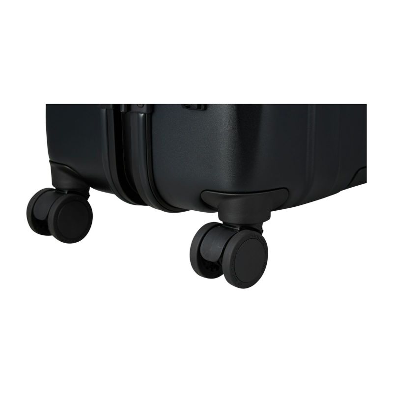 キャスターは、日本メーカーの日乃本錠前製の静音キャスターを採用。早朝や夜間、静かな場所でのゴロゴロ音も気にすることはありません。ダブルキャスターなので凹凸の多い路面でも安定した走行が可能です。ストッパー付きなので、電車等に乗った際にスーツケースが転がっていく心配がありません。