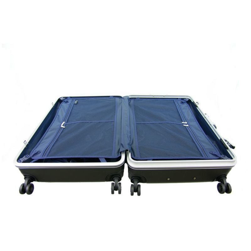 頑丈なアルミフレーム。ボディには頑強な素材であるABS樹脂を使用。双輪キャスターを搭載していますのでバツグンの安定力と走行性を発揮してくれます。内装両側にある中仕切りにはポケットが4箇所、X字止めベルトも装備し、荷崩れを防止。TSAロック機能も搭載しています。