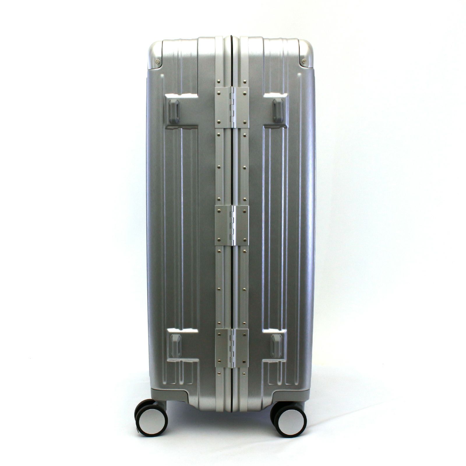 ボディは本物のアルミニウムのようなアルミ調ポリカーボネートフィルムを使用。アルミよりも自重が軽く仕上げられ、移動する際のからだの負担を軽減します。ボディのコーナーパッドはアルミ製を採用。角の傷つきやへこみからスーツケースを守ります。