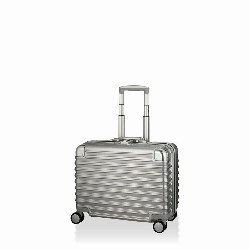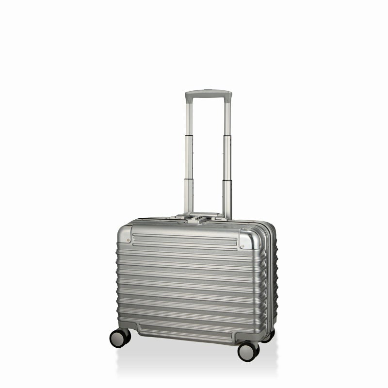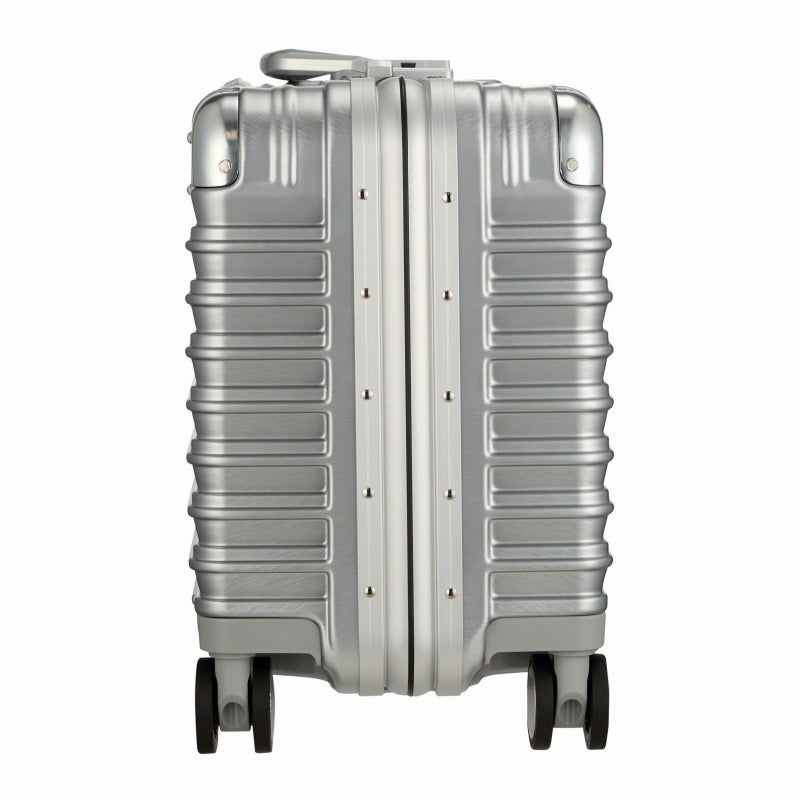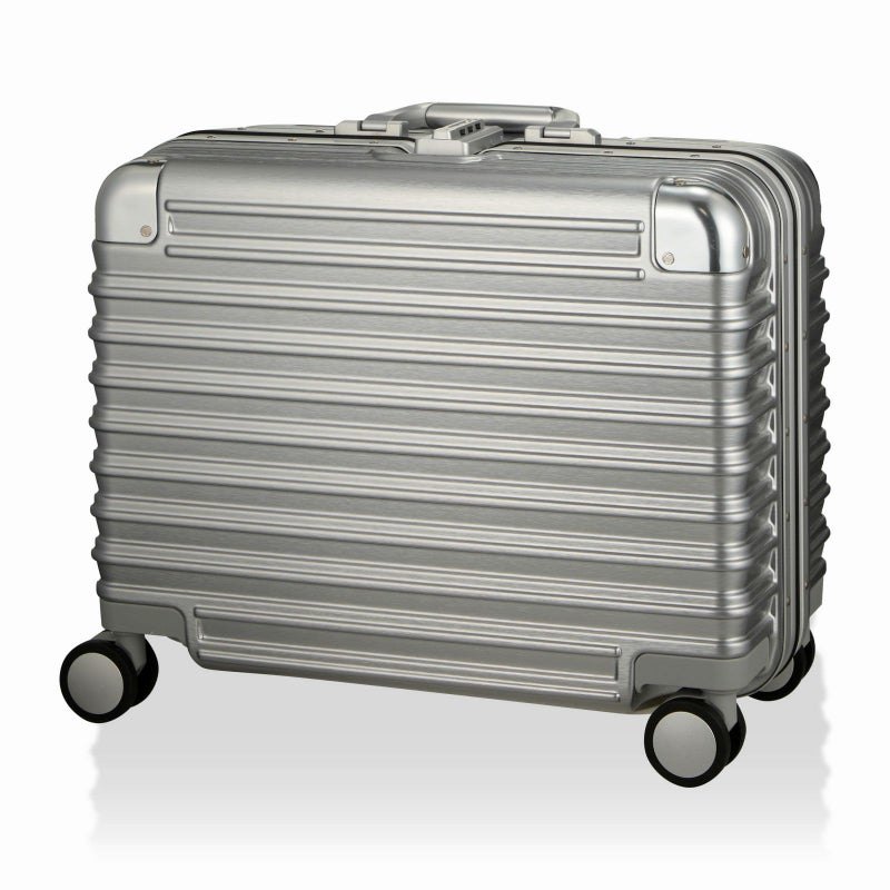 ボディは本物のアルミニウムのようなアルミ調ポリカーボネートフィルムを使用。アルミよりも自重が軽く仕上げられ、移動する際のからだの負担を軽減します。ボディのコーナーパッドはアルミ製を採用。角の傷つきやへこみからスーツケースを守ります。
