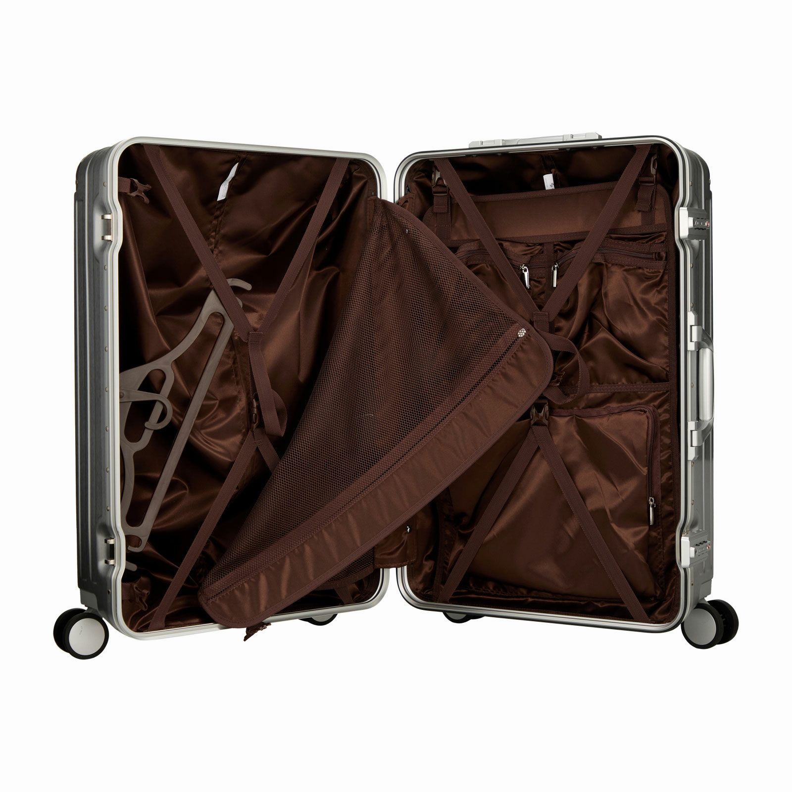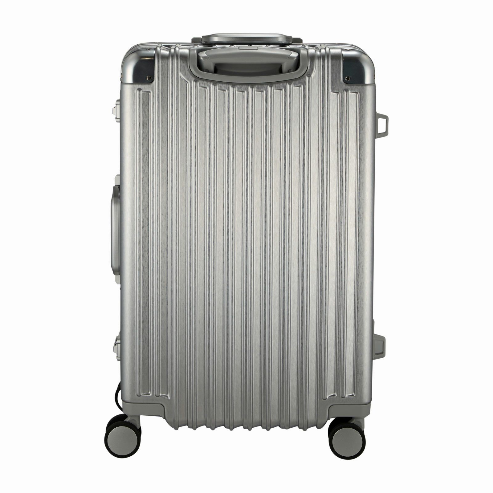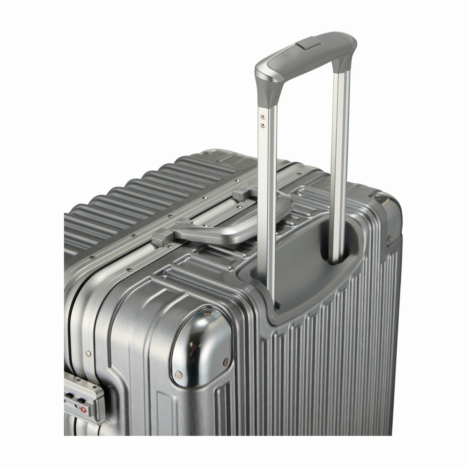 ボディは本物のアルミニウムのようなアルミ調ポリカーボネートフィルムを使用。アルミよりも自重が軽く仕上げられ、移動する際のからだの負担を軽減します。ボディのコーナーパッドはアルミ製を採用。角の傷つきやへこみからスーツケースを守ります。