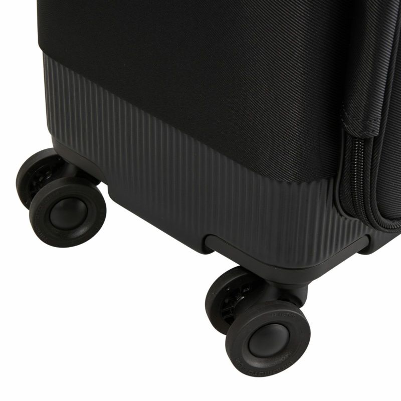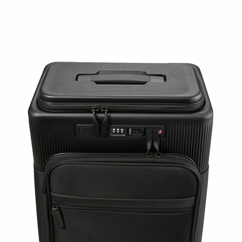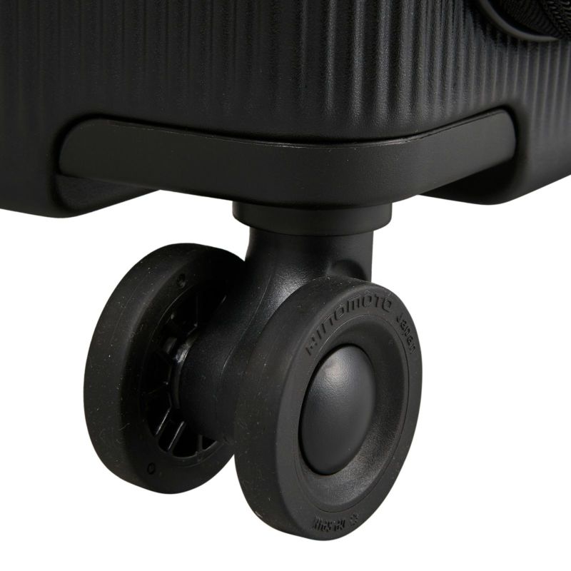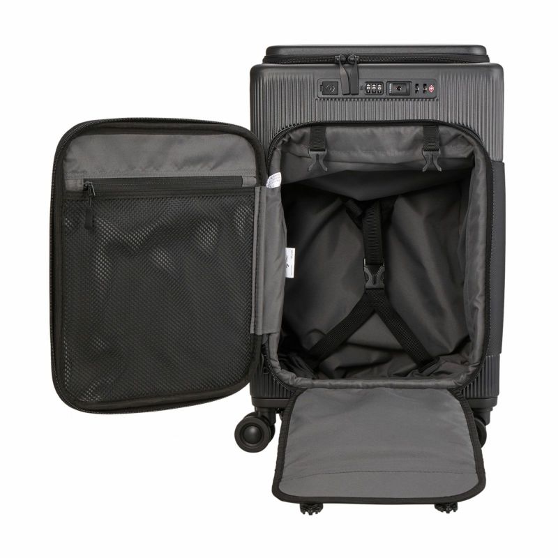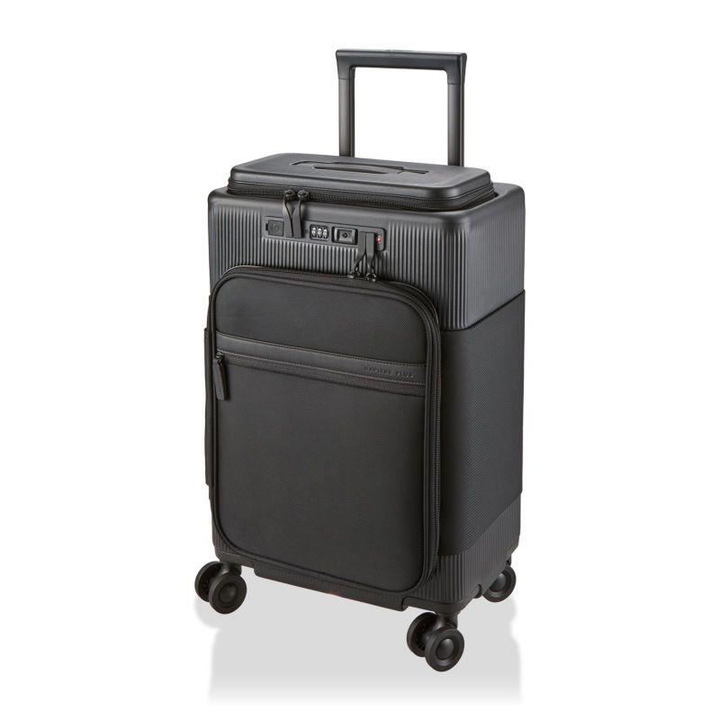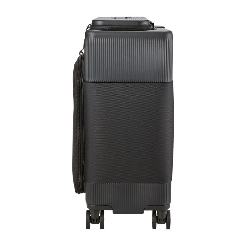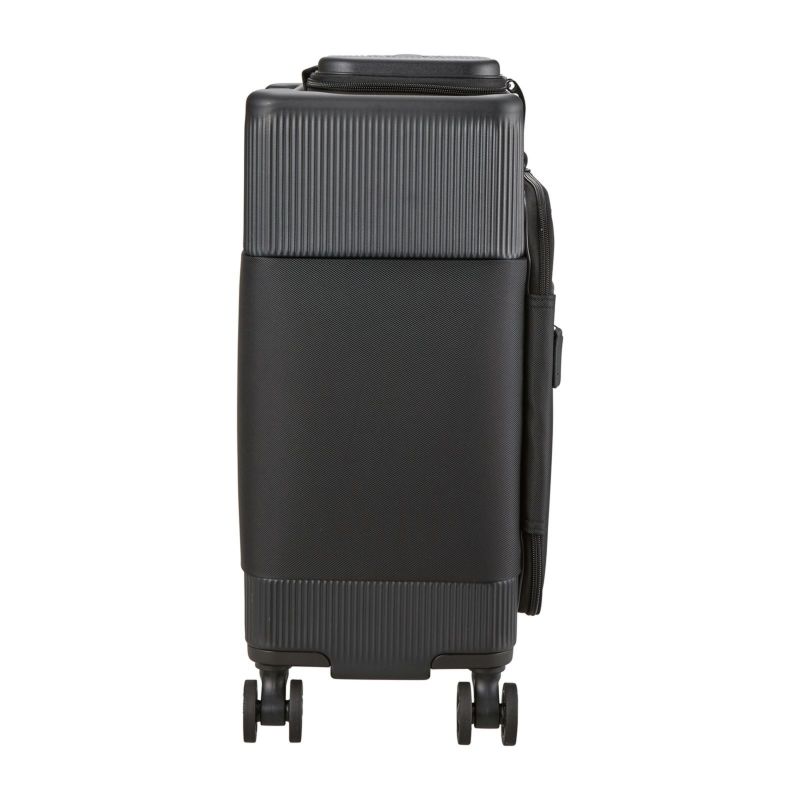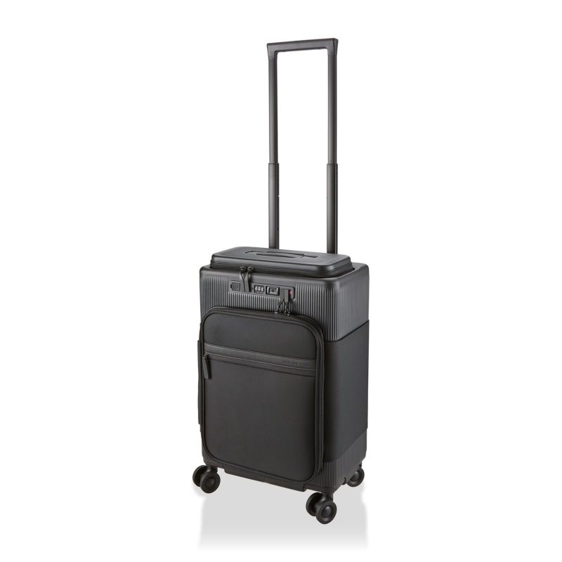ボディ部分はハードスーツケースによく使われる剛性・耐衝撃性がある『ABS樹脂』と、飛行機の窓などにも使われる頑強&軽量素材の『ポリカーボネート』を加えた混合素材、そして横にパカっと開くスーツケース前面のフタ部分はソフトキャリーによく使われる『ポリエステル』素材を採用。ハードスーツケースとソフトキャリーの特徴を併せ持ったハイブリッドタイプのスーツケースです。