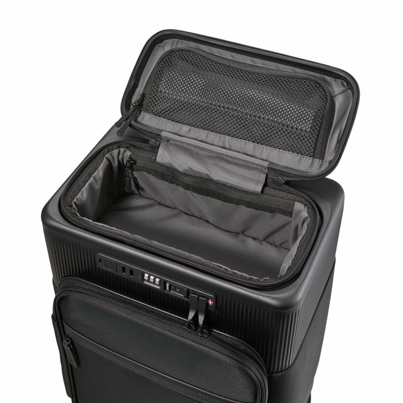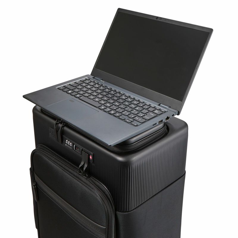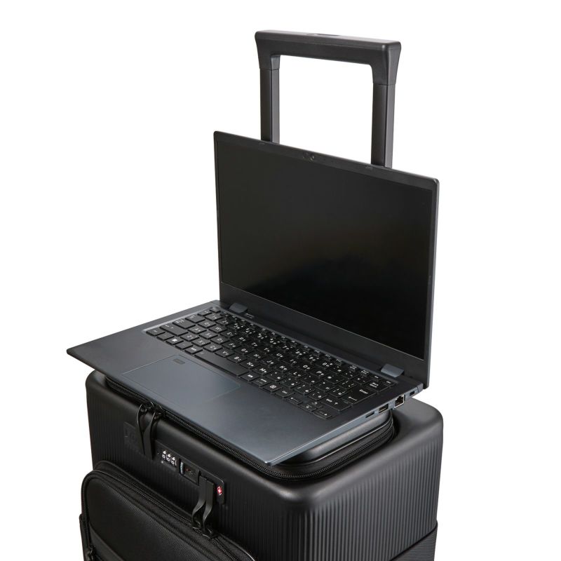 スーツケースの上部がパカっと開く『上パカ』仕様。上部のフタをパカっと開くと、収納スペースが現れます。すぐに取り出したいアイテムの収納に便利です。ポケットも付いているので、小物をなくさないように収納することもできます。また、この上部のフタはノートPCを置いたりとちょっとした台にもなります。