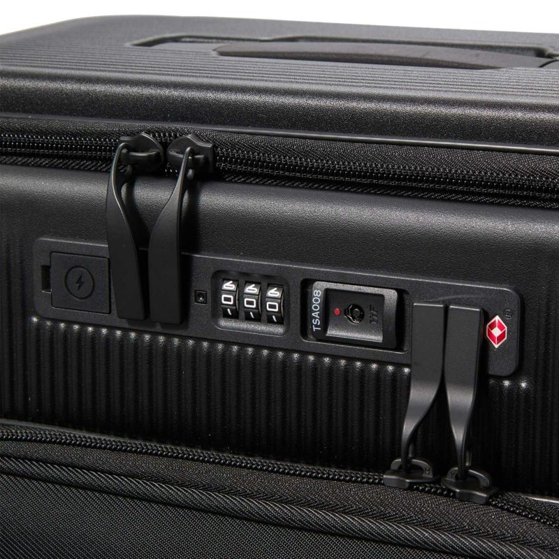 ロックはダイヤルロックを採用。さらに、アメリカ方面への旅行時、鍵をかけたまま航空会社に荷物を預けることが可能なTSロックも搭載。また、ロック付近にはUSBポートもついているので、スマートフォン等を充電する際に便利。