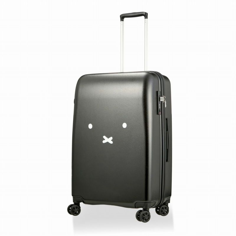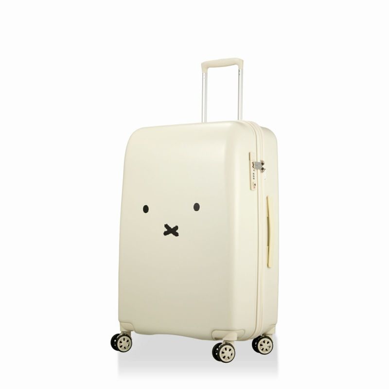 スーツケースのボディ前面にプリントされたミッフィーのお顔が可愛い!ボディ背面にはミッフィーのロゴプレートが付いており、側面にはひょっこりとのぞくミッフィーのタグがついています。内装はベージュの生地にミッフィーとお花の総柄デザイン、そして内装ファスナートップはミッフィーの形をしていて可愛さ満載!