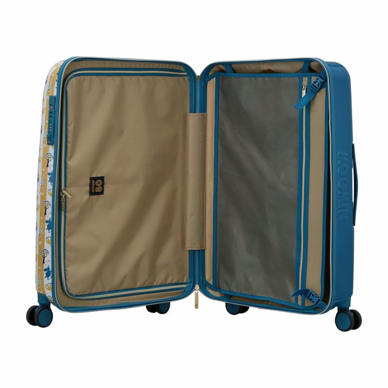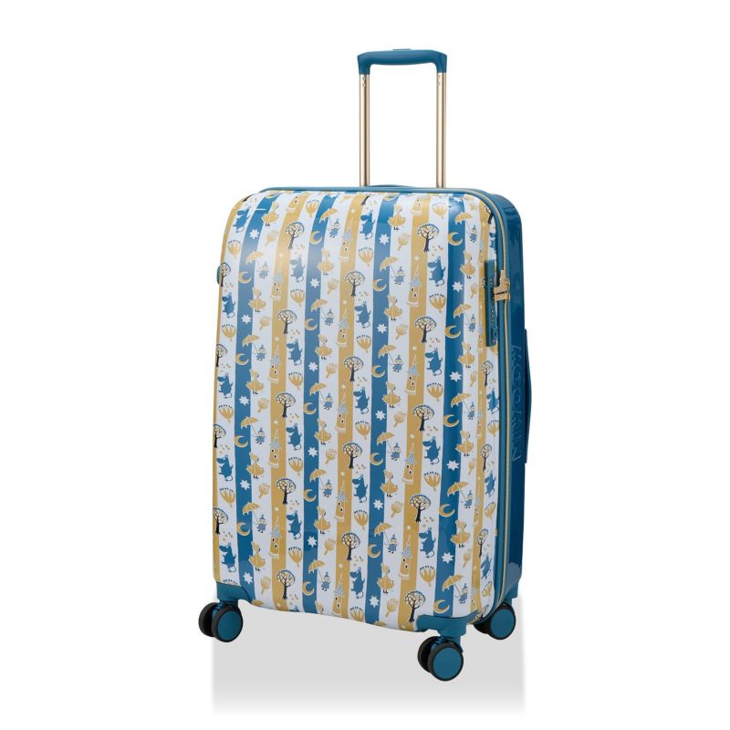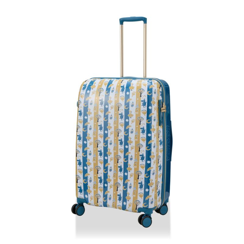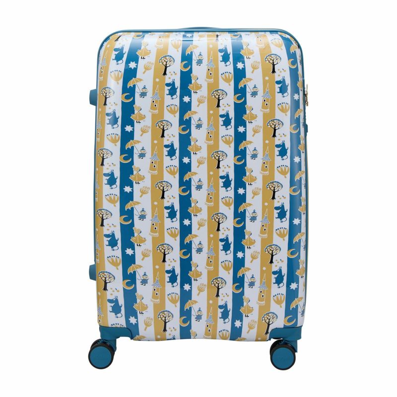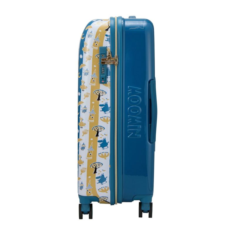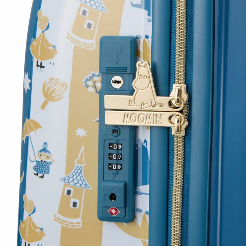 スーツケース前面はブルーストライプにムーミンやリトルミイ、ムーミンやしきのイラストが散りばめられたデザインです。背面にはムーミンの後ろ姿がエンボス加工でデザインされています。ロックのファスナートップはムーミンの形をしています。