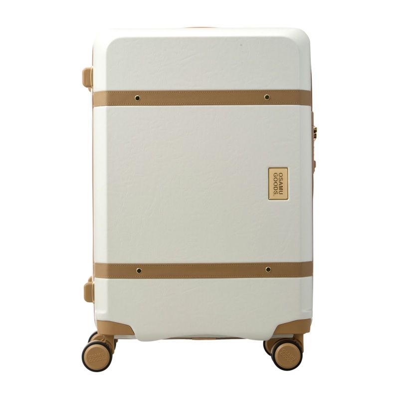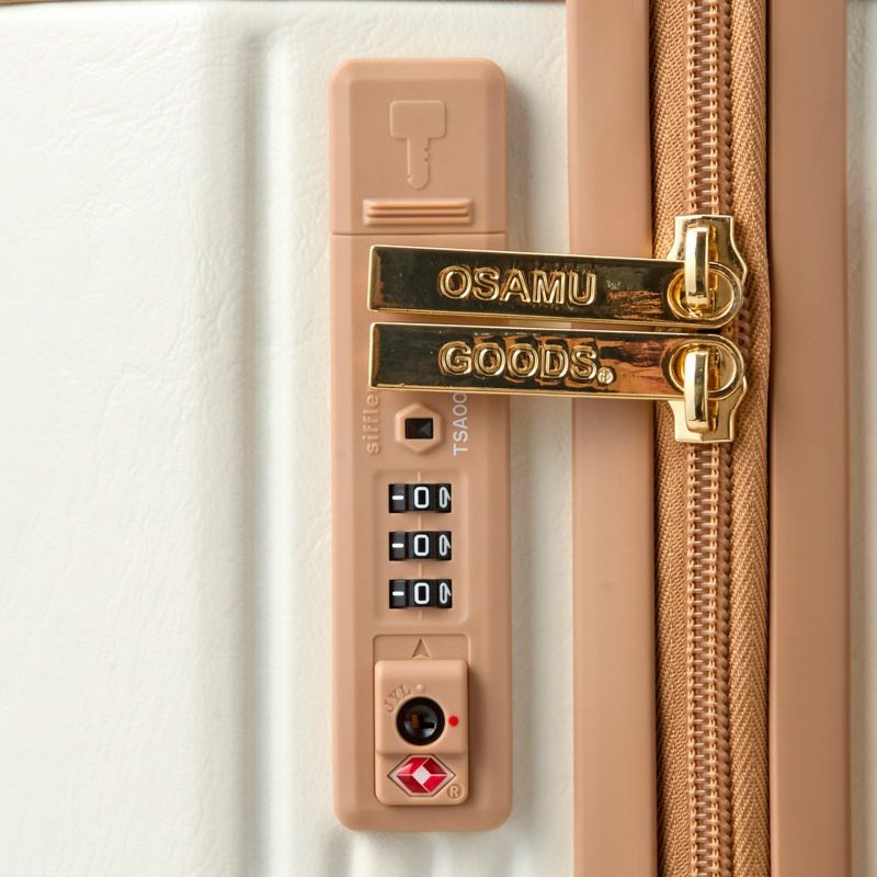 メインファスナーとキャスターにはOSAMU GOODSのロゴが入っています。双輪キャスターを採用し、安定した走行が可能です。スーツケースの片側側面は台座フック付きなので、コンビニの袋等軽いものを掛けることができます。