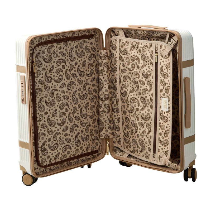 ジル&ジャックがデザインされたネームタグ付き。スーツケースの内装はジル、ジャック、ドッグ、キャットがデザインされたペイズリー柄を採用。フタ側の内装はファスナーで閉じられるので、開閉時に荷物がこぼれる心配がありません。胴側の内装は荷崩れを防止するクロスベルトと間仕切り付き。