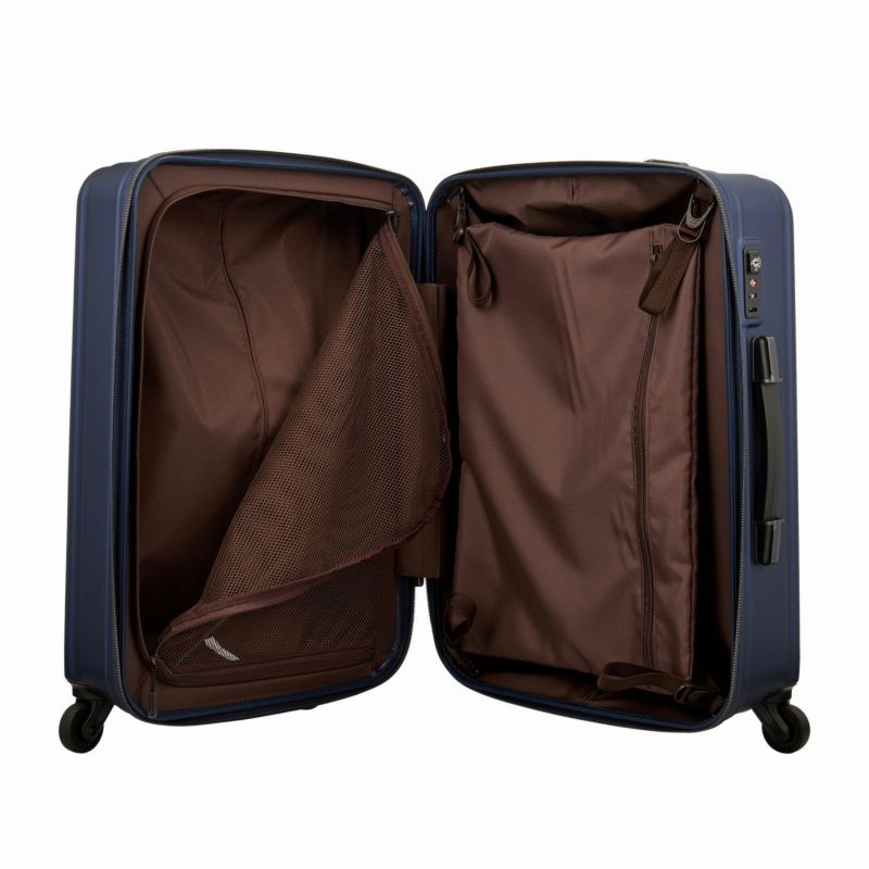 内装はフタ側はメッシュファスナー仕様で開閉時に荷物がこぼれる心配がありません。また、胴側の内装は荷崩れを防止するクロスベルトと間仕切り付き。