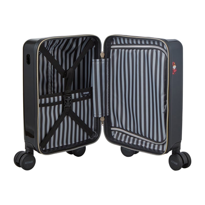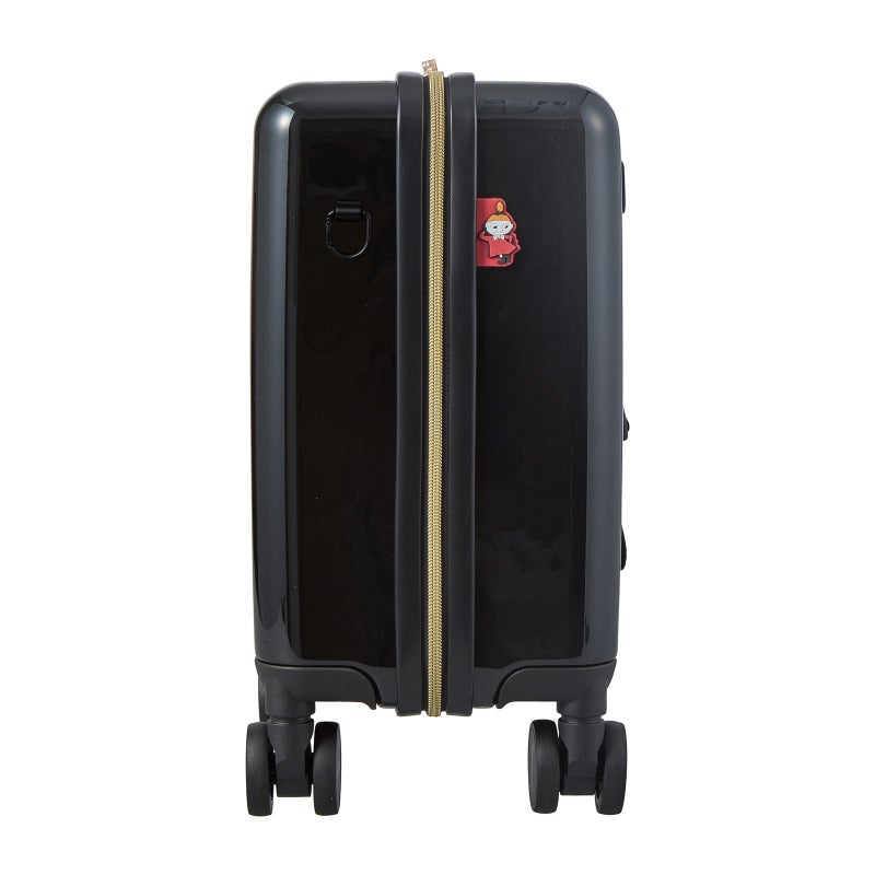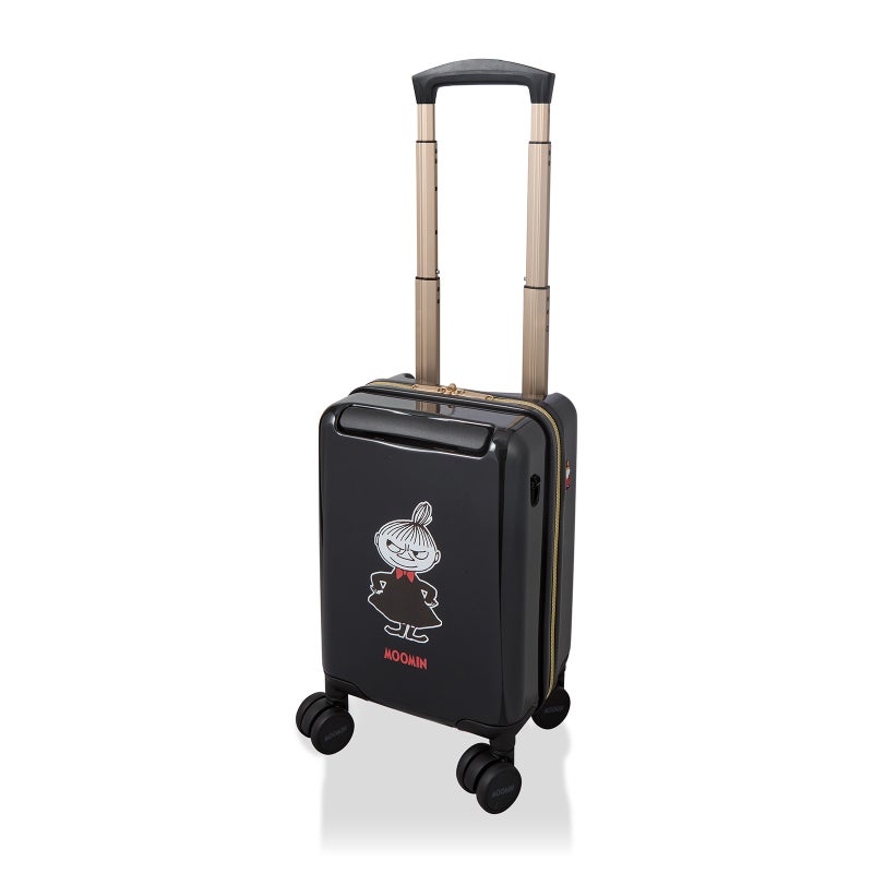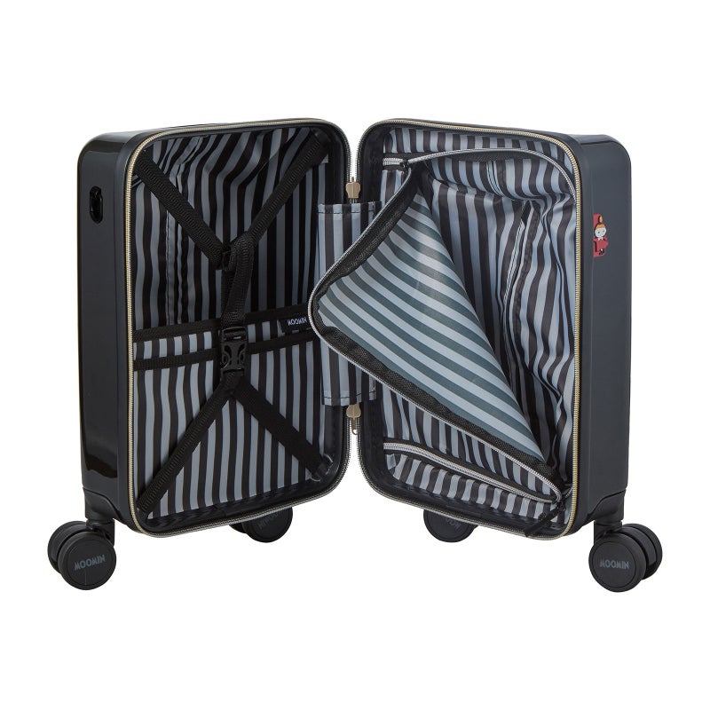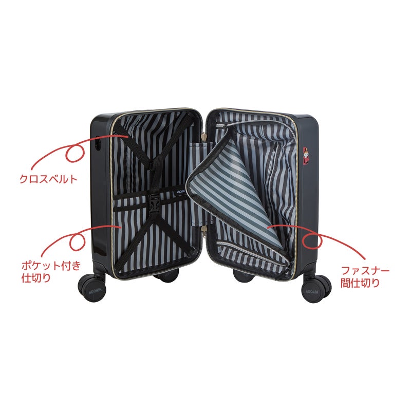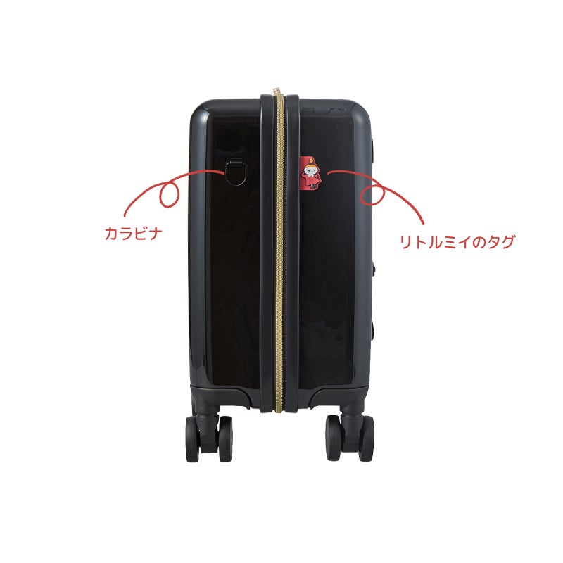 ボディ前面にはリトルミイの姿が大きく描かれています。内装生地は黒×白のストライプで、モノトーンの落ち着いた雰囲気。ボディ側面についたリトルミイのタグがワンポイントの可愛さをプラス。キャスターにも「MOOMIN」のロゴが入っており、細部までこだわったデザイン。