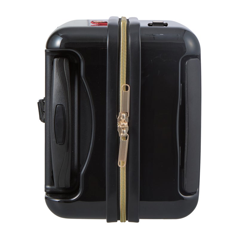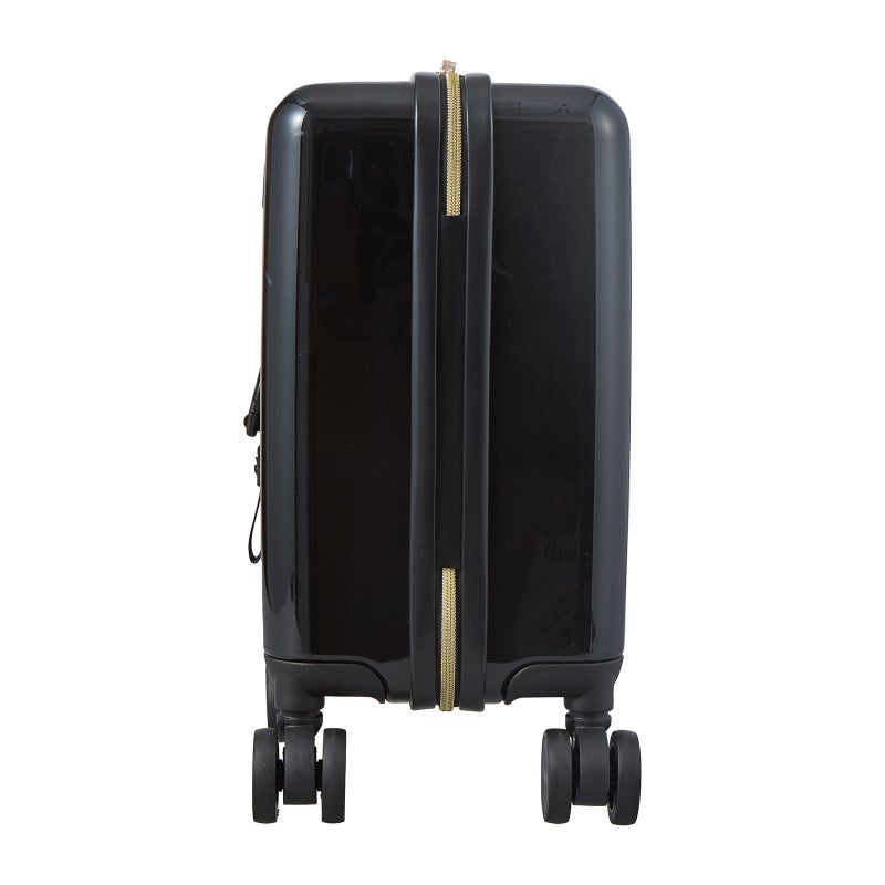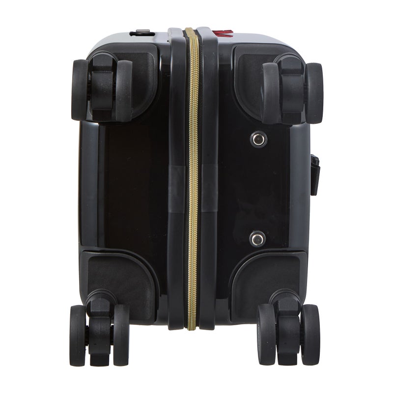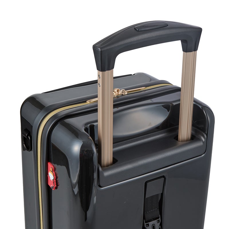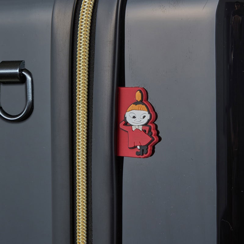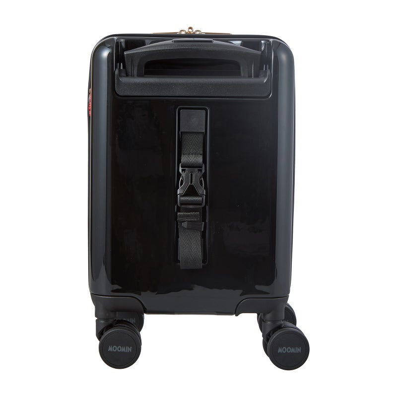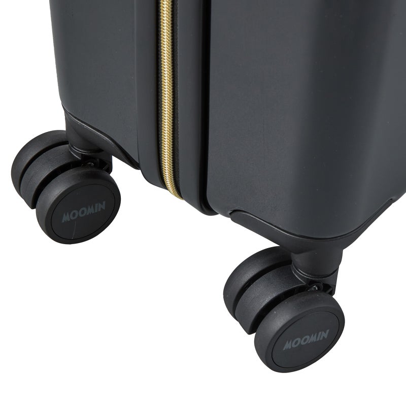 ボディ前面にはリトルミイの姿が大きく描かれています。内装生地は黒×白のストライプで、モノトーンの落ち着いた雰囲気。ボディ側面についたリトルミイのタグがワンポイントの可愛さをプラス。キャスターにも「MOOMIN」のロゴが入っており、細部までこだわったデザイン。