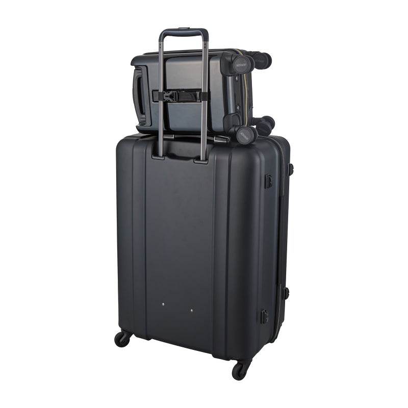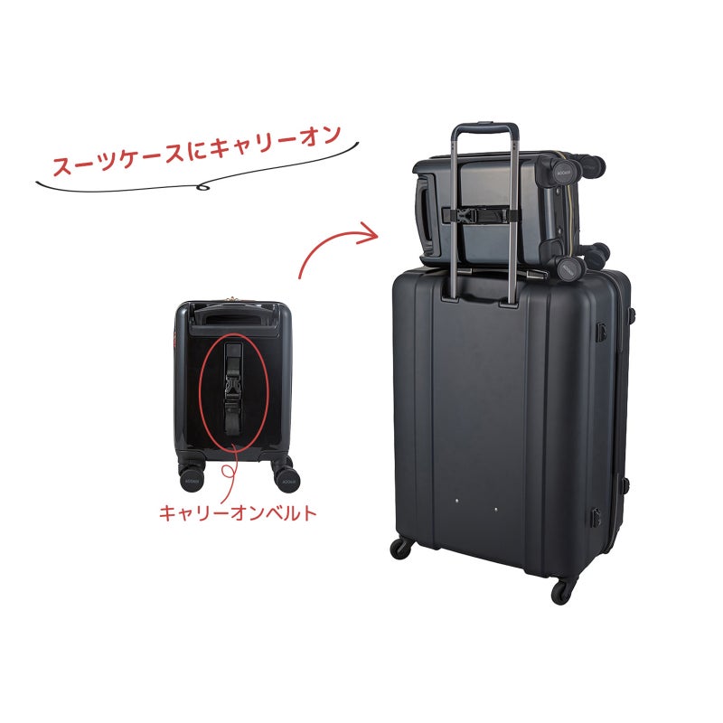 背面にはキャリーオンベルト付き。プチキャリーを引くのに疲れてきたら、お手持ちのスーツケースにキャリーオンベルトで固定できるので、移動の負担を軽減できます。