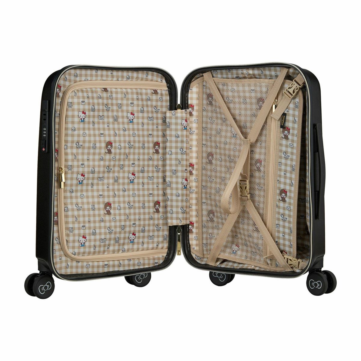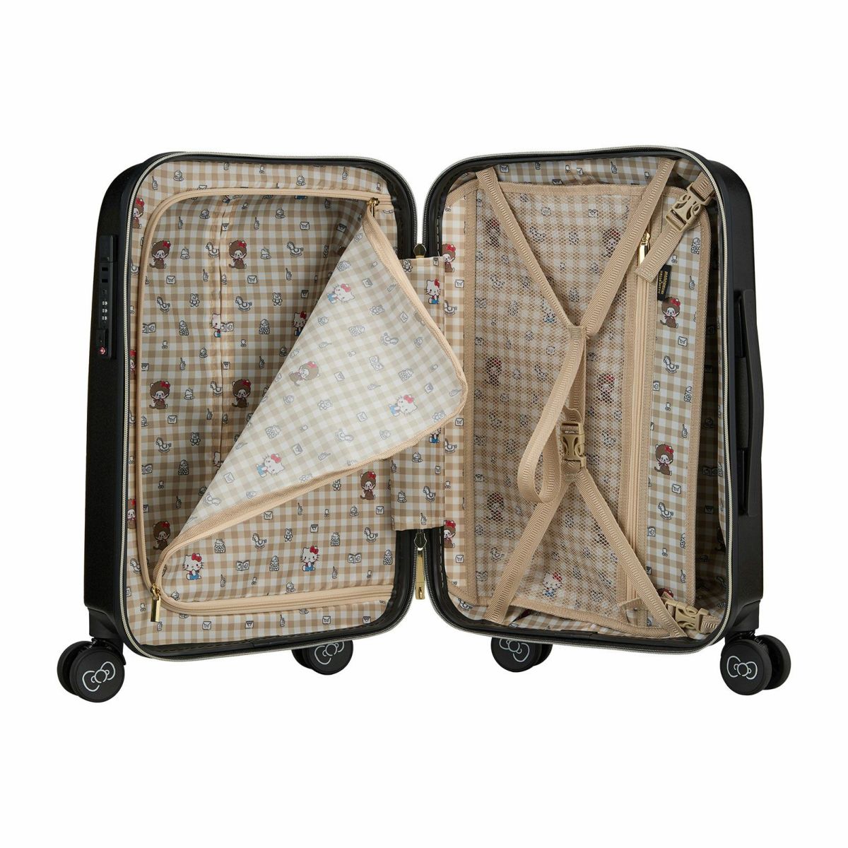 他の画像を見る モンチッチ×ハローキティ 1年保証 機内持ち込みサイズ ダブルキャスター シフレロック スーツケース モンチッチ×ハローキティ Sサイズ カップホルダー付き ジッパータイプ HPL2249-48 販売価格 ¥ 17,380 税込