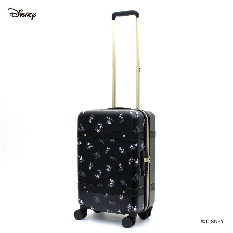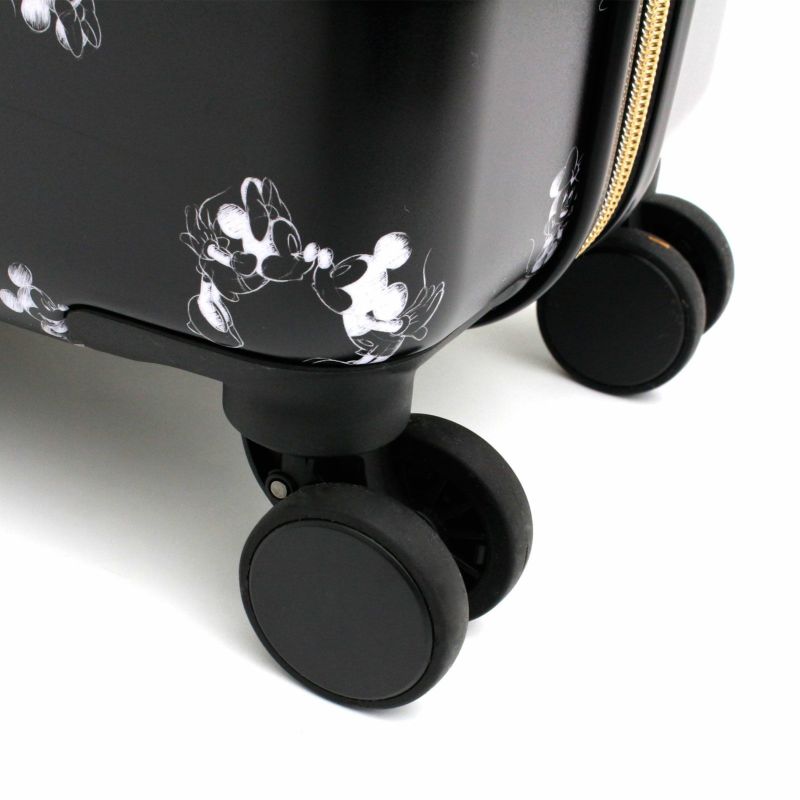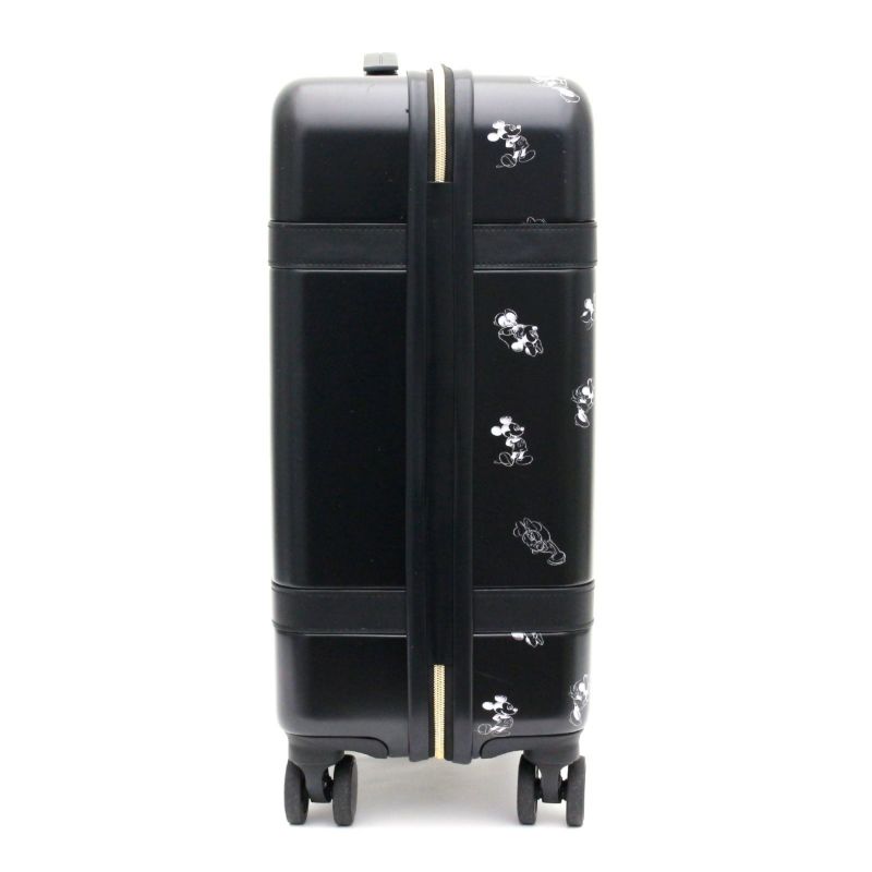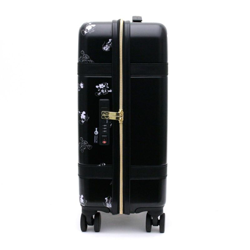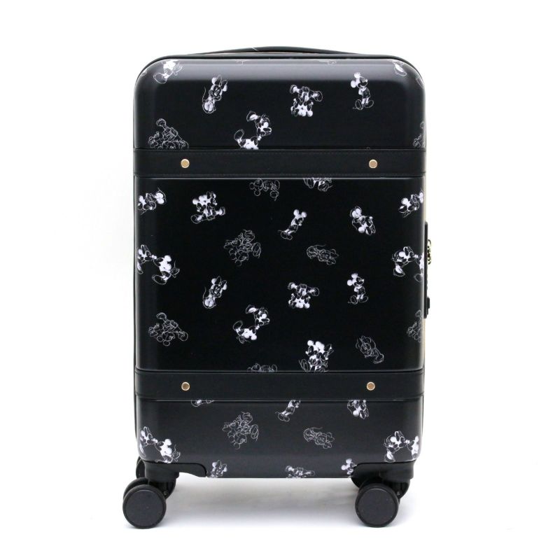 前面はブラックベースにミッキーとミニーがスケッチ風に描かれており、背面は無地のブラックでシンプルなデザイン。ボディーに埋め込まれた2本の合皮バンドがおしゃれで落ち着いた雰囲気を演出します。内装生地はミッキーのお顔の総柄デザイン。外側のロックのファスナートップにもミッキーのお顔がデザインされており、細部までデザインにこだわっています。