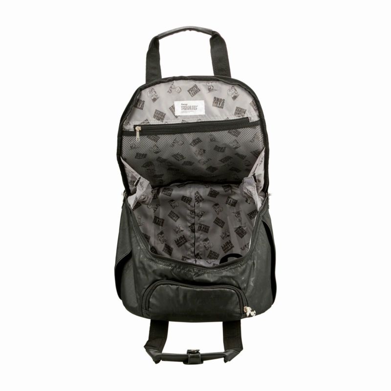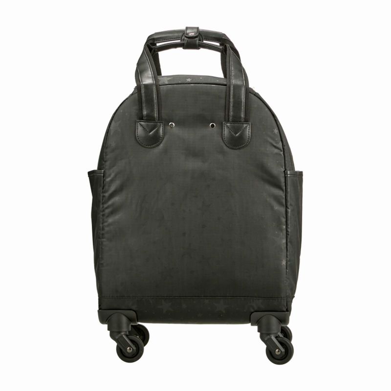 キャリーバーは段階調節可能。キャリーバーを使わない時は、キャリーバー収納部にしまってファスナーでしまうことで隠すことができるような仕様になっています。キャスターは360度回転のシングルキャスターが4輪ついています。持ち手ハンドルもついているので持ち上げて運ぶ際にも困りません。