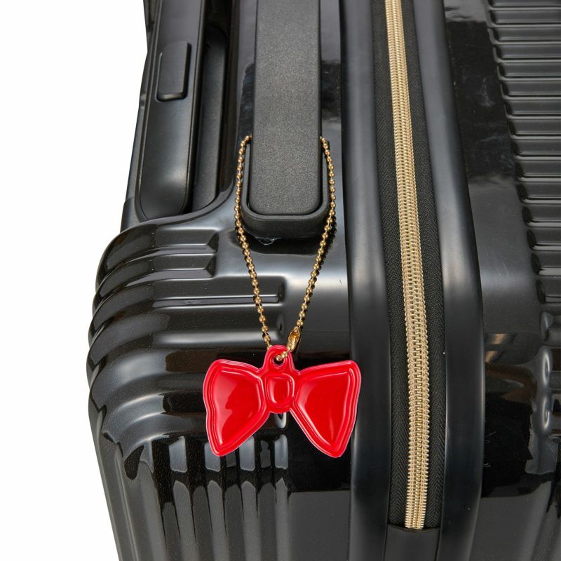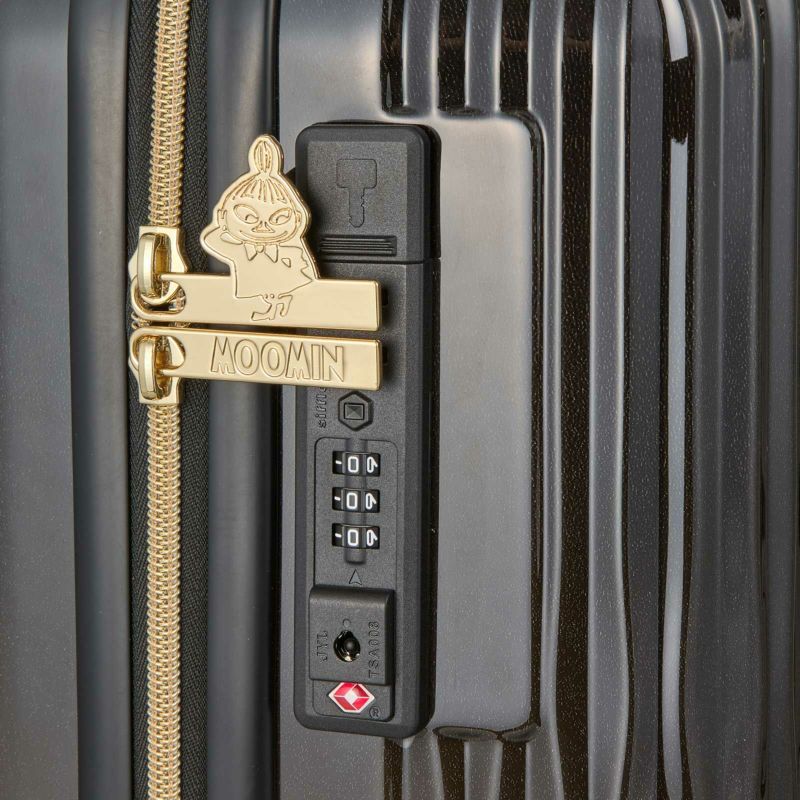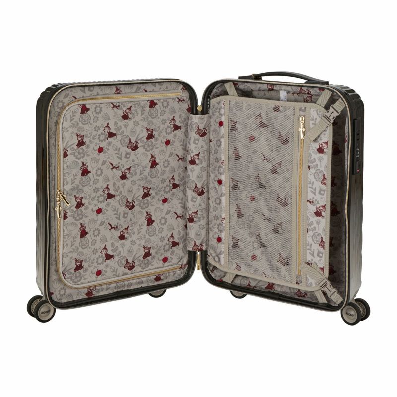 スーツケースのボディが黒とグレーのグラデーションでモノトーンな雰囲気。ボディ前面右下のリトルミイのプレートがワンポイントで可愛い。リトルミイの赤いリボンの形をしたリフレクトチャーム付きです。内装は様々な表情をしたリトルミイがピクニックでりんごやお花、ジャムやバスケットに囲まれている様子が描かれた総柄模様。ロックのファスナートップにはリトルミイとMOOMINロゴがあしらわれています。キャスターにもMOOMINロゴが!細部までこだわったデザインです。