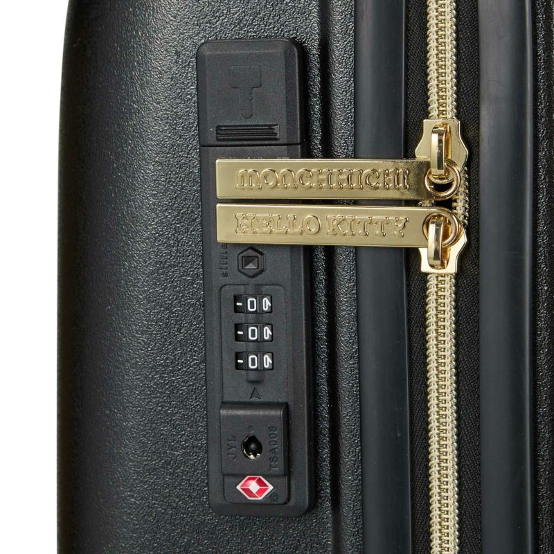 スーツケースのボディ前面にはお揃いの赤いリボンをつけたモンチッチとハローキティのイラストが描かれており、MONCHHICHI×HELLO KITTYのロゴが刻印されたプレートが付いています。キャスターにはリボンのイラストが描かれており、内装生地はベージュのギンガムチェックにモンチッチとハローキティのイラストの総柄で可愛い。細部までこだわったデザインです。