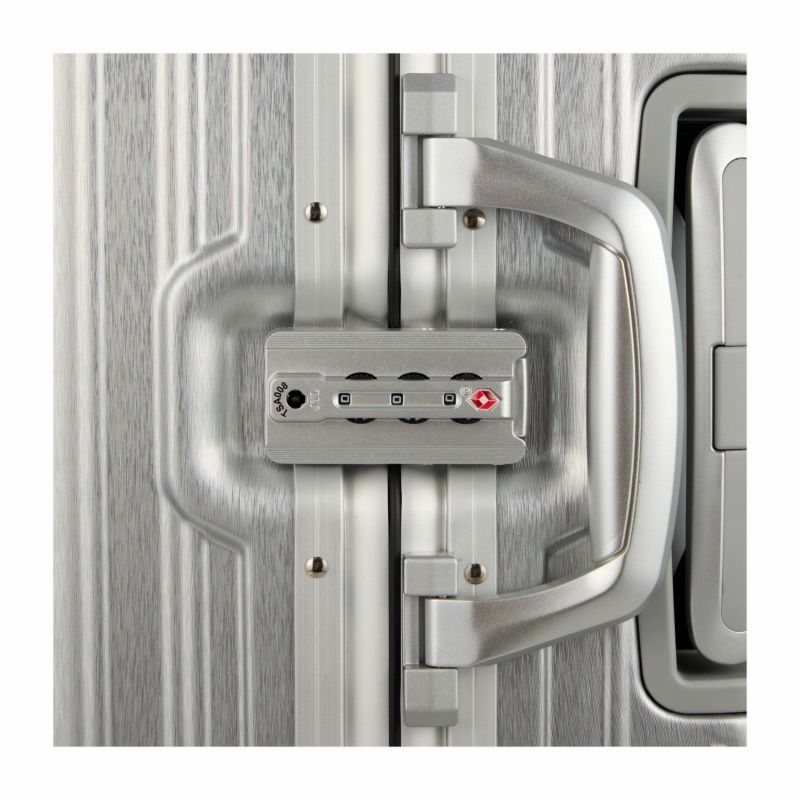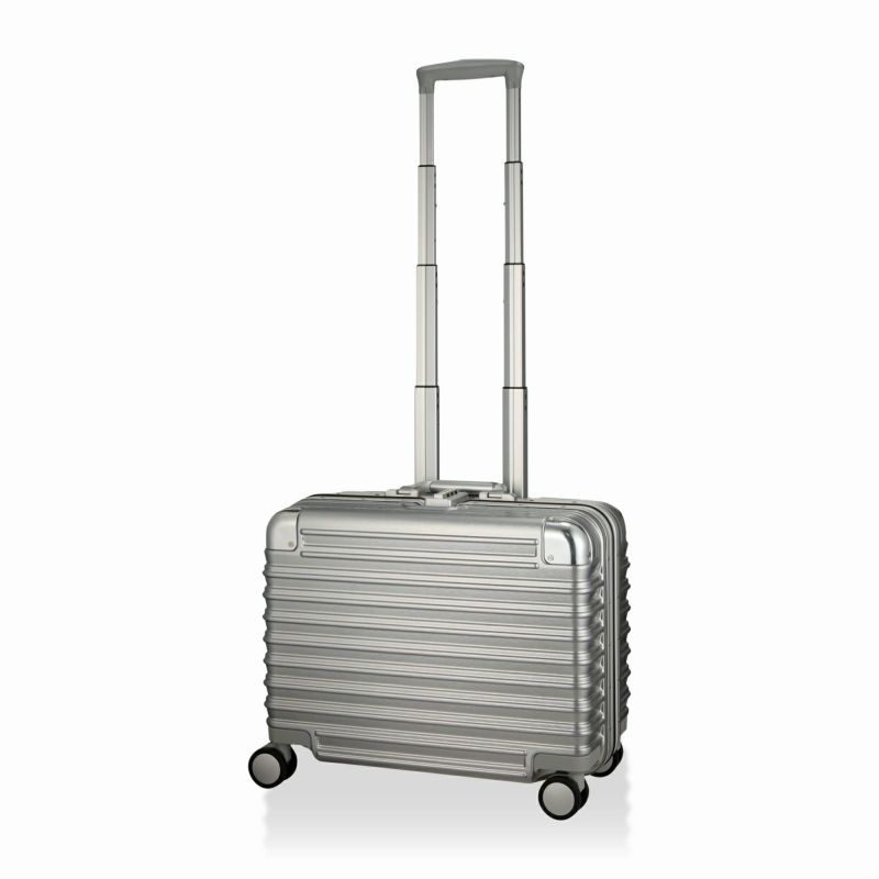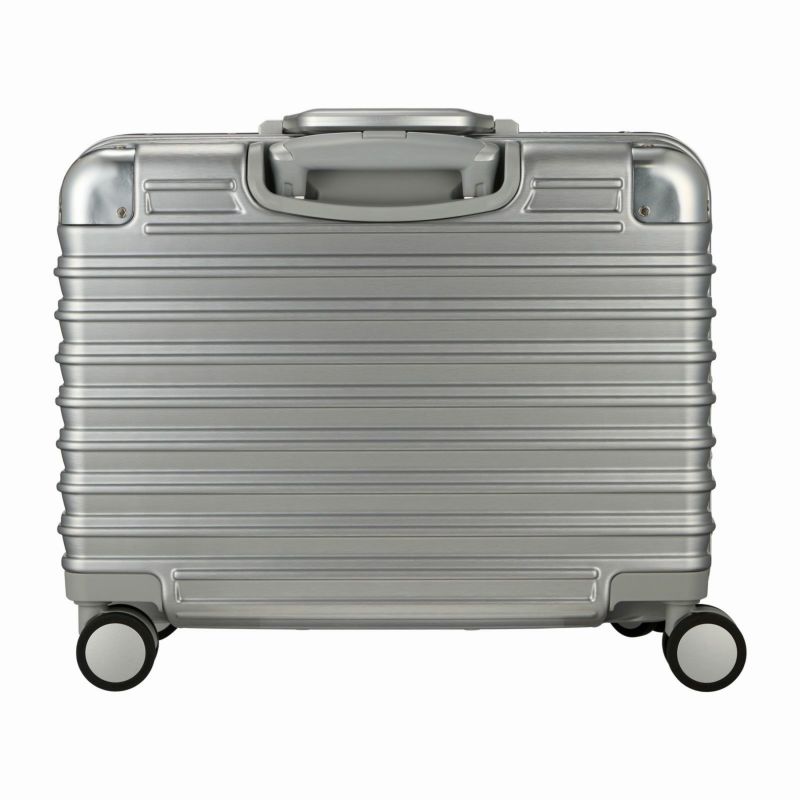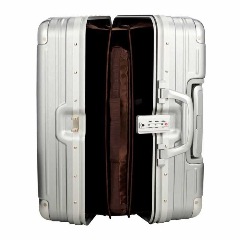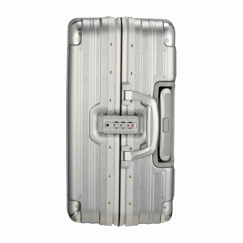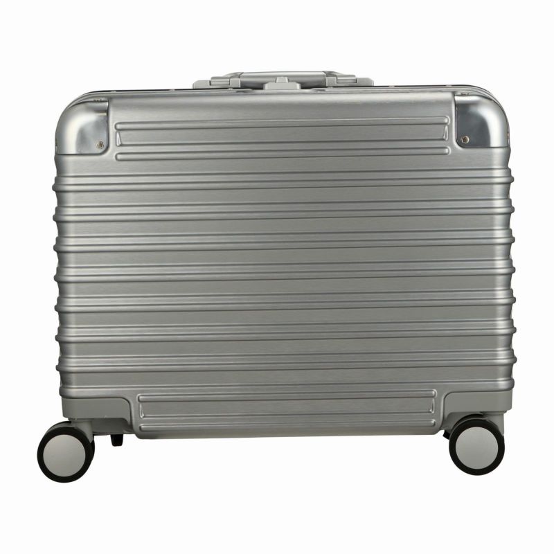 ボディは本物のアルミニウムのようなアルミ調ポリカーボネートフィルムを使用。アルミよりも自重が軽く仕上げられ、移動する際のからだの負担を軽減します。ボディのコーナーパッドはアルミ製を採用。角の傷つきやへこみからスーツケースを守ります。