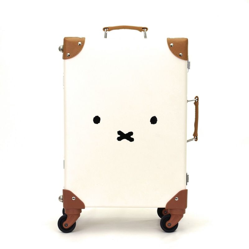 ミッフィーのかわいいフェイスのトランクキャリー。合成皮革で作られておりクラシカルでおしゃれな雰囲気。内装生地にはかわいいミッフィーの花柄をプリント。内装のファスナートップもミッフィーの形で、細部までこだわった作りです。