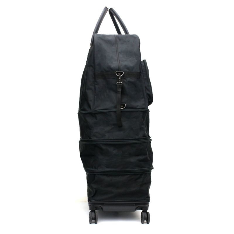 便利な3段階拡張式。ファスナーを開閉するだけでサイズ調整ができるので、用途に合わせて使えます。MAX時は約265Lの特大容量!未拡張時でも約105Lの容量で収納力抜群。使わないときは小さく畳めるので保管場所にも困りません。安定した走行を可能にするためダブルキャスターを4個採用し、底面中央には重くなっても底が沈まないよう単輪の補助キャスターを設置しています。取り外し可能なストラップが付いているので、移動の際はストラップを引いて楽に移動することができます。